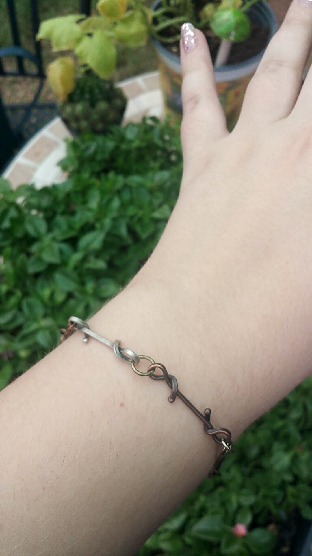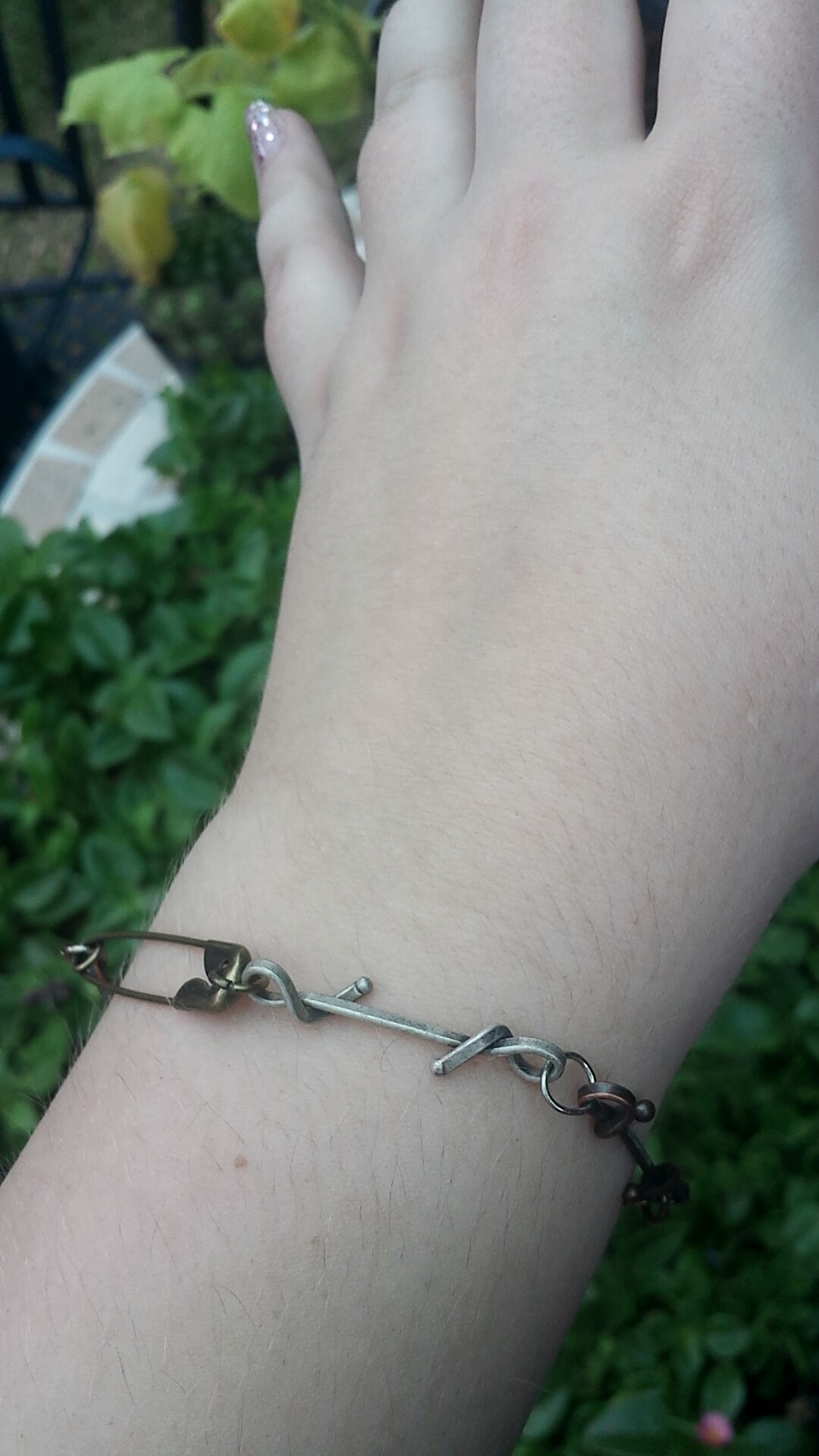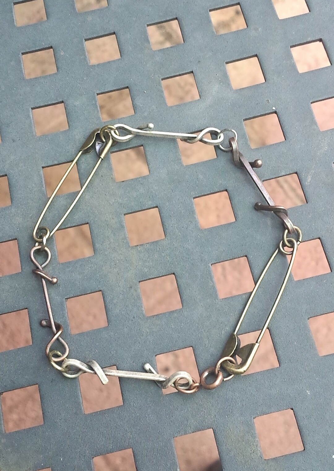 Little twisted silver and bronze metal bars and large gold safety pins - 9" long - spring ring clasp