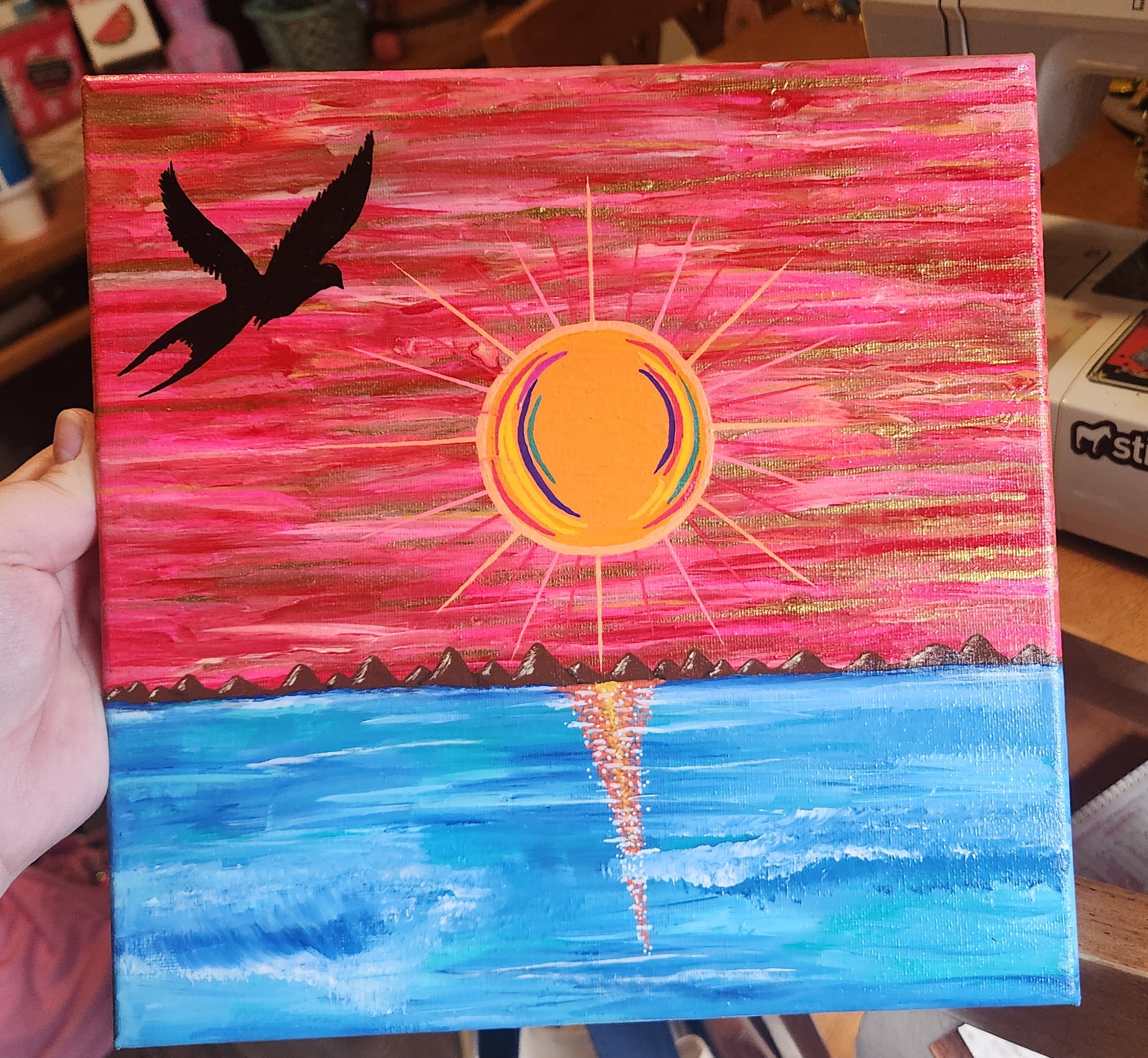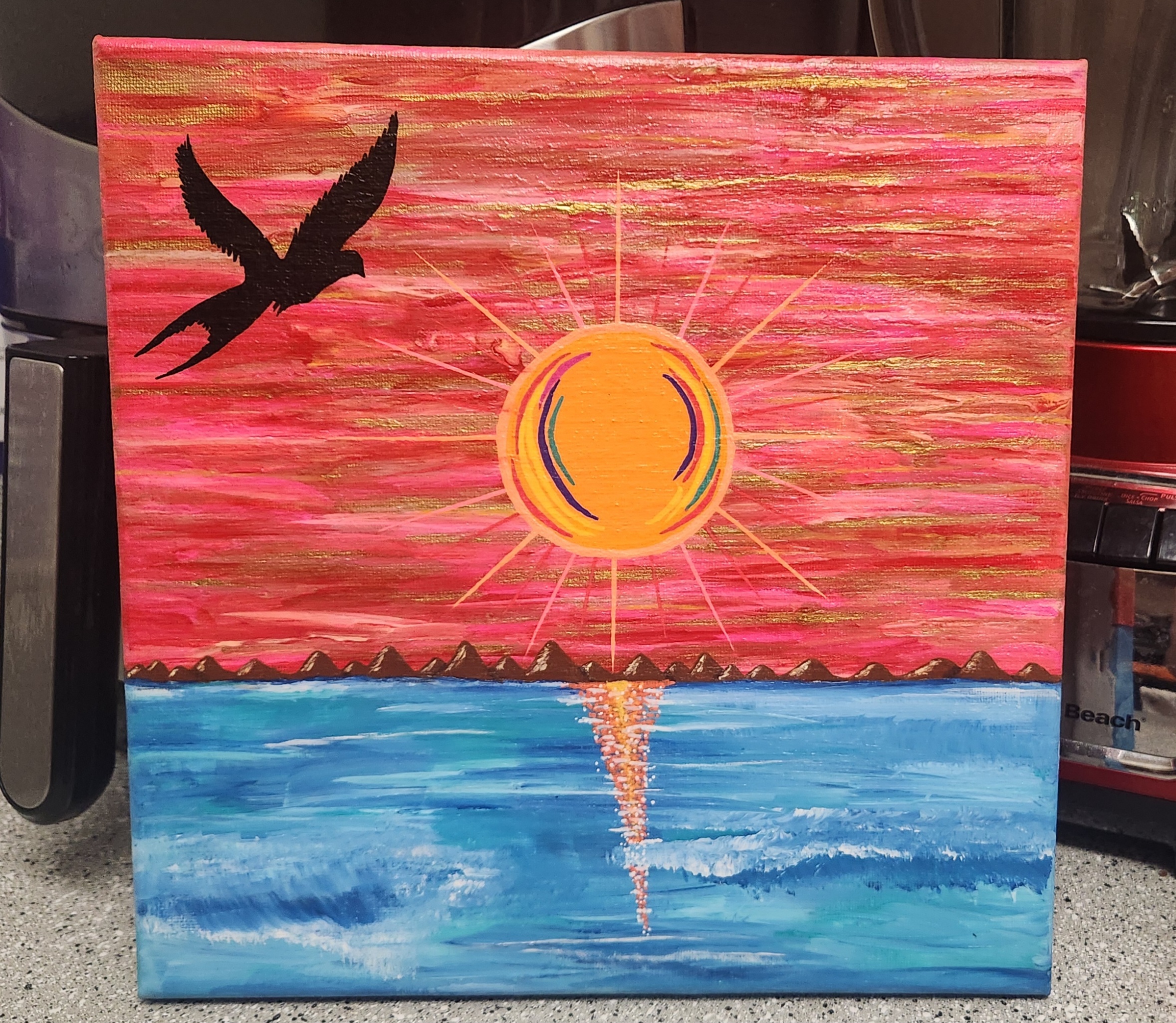 Original sunset ocean painting - Acrylic, gel pens, Posca and Sharpie paint pens, and gloss medium - 12" x 12" - signed and dated on the back