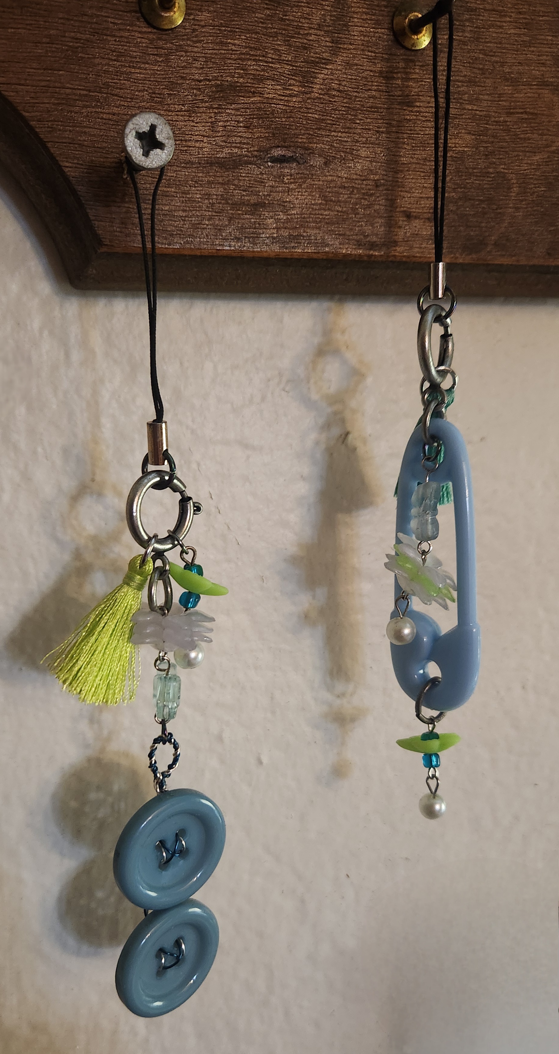 Both charms each have a tassle dangle, a handmade stacked white flower dangle, and a handmade green flower dangle. One charm features a large blue acrylic safety pin and the other features a handmade wired teal button charm!