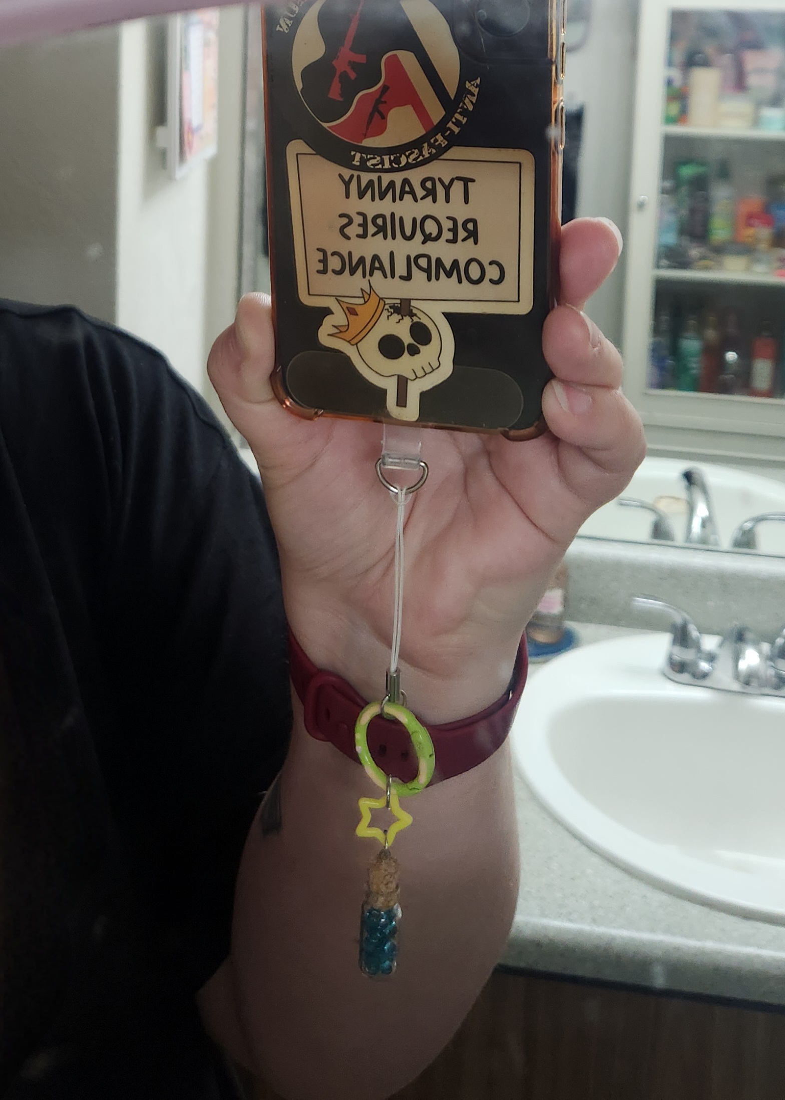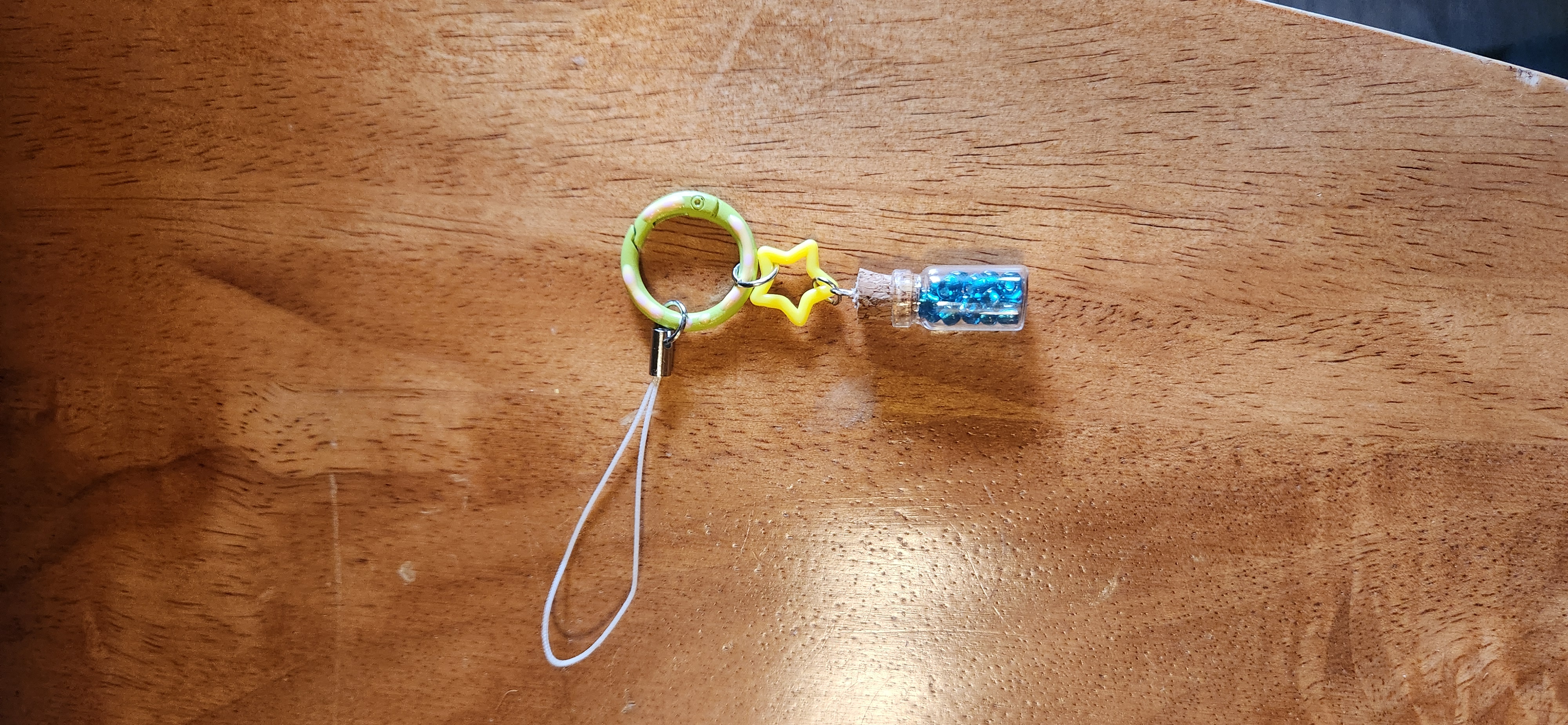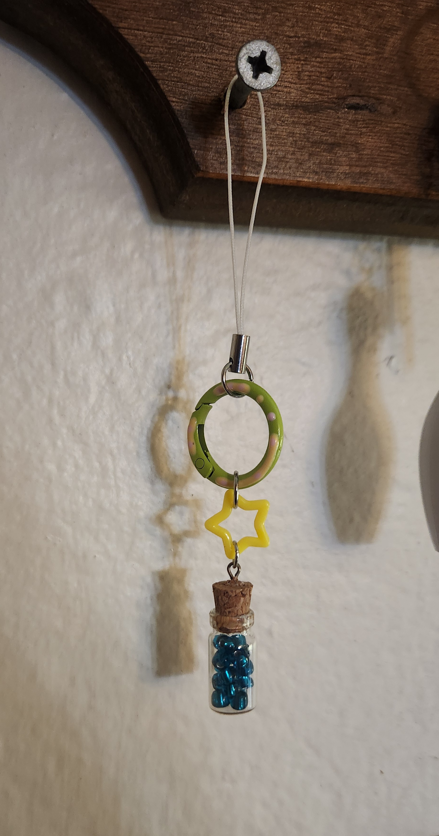 Minimalist phone charm with a green and yellow clasp, a yellow star, and a mini glass bottle filled with tiny blue beads!