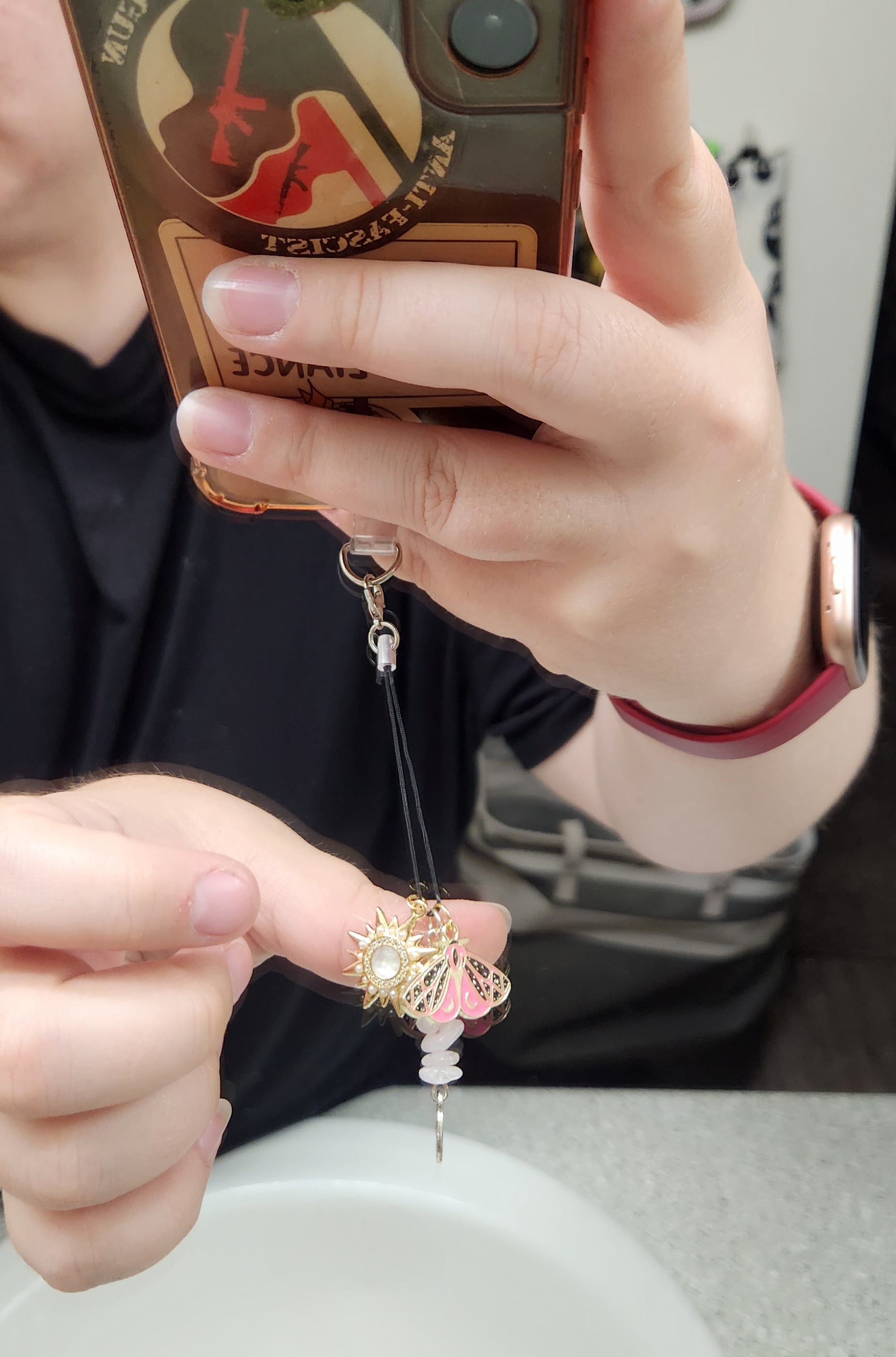 Matching set of moth and moon phone charms, one for you and one for a friend! One charm with pink beads and charms and one with blue!