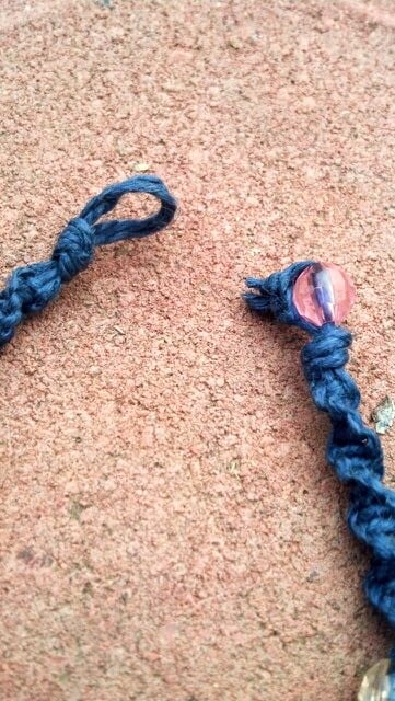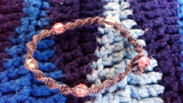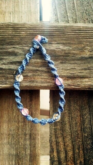 Woven blue cord bracelet with pink and light yellow beads Can also be worn as an ankle bracelet - 9 1/2" long - toggle button closure