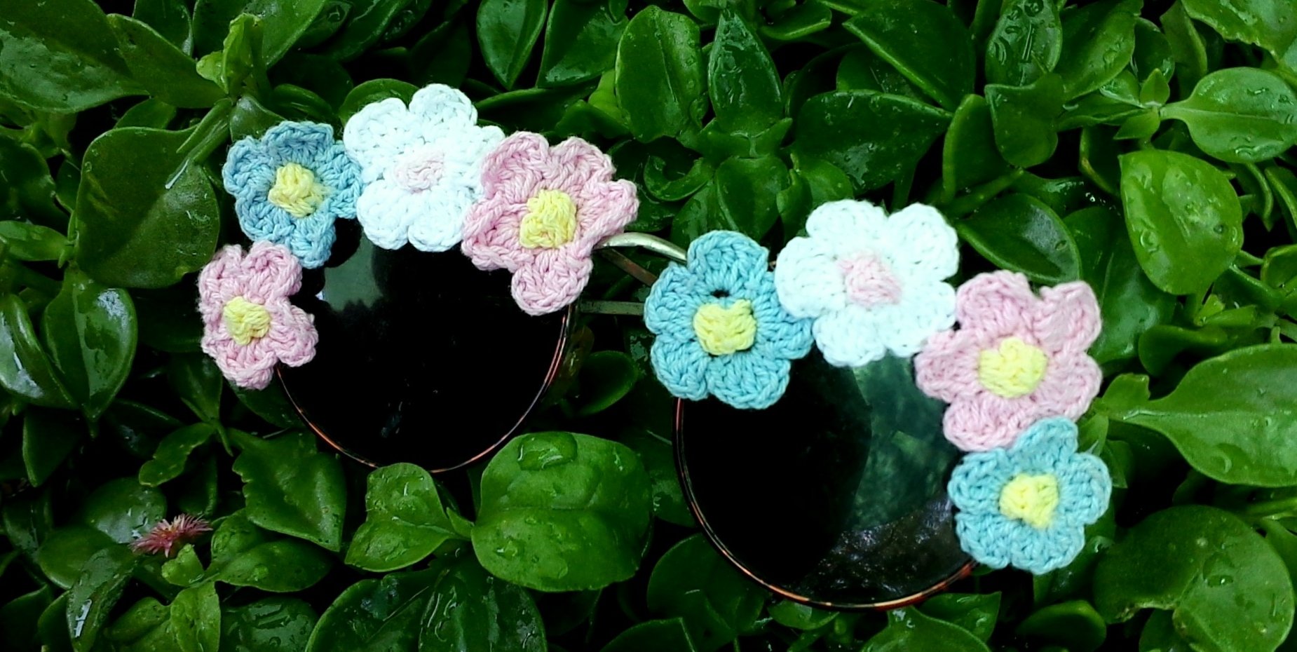 Cutie little crocheted pink, blue, and white flowers attached to sunglasses frames Two different styles! - round sunnies: 5" across, 2 1/4" tall - oval sunnies: 5 1/2" across, 2 1/4" tall