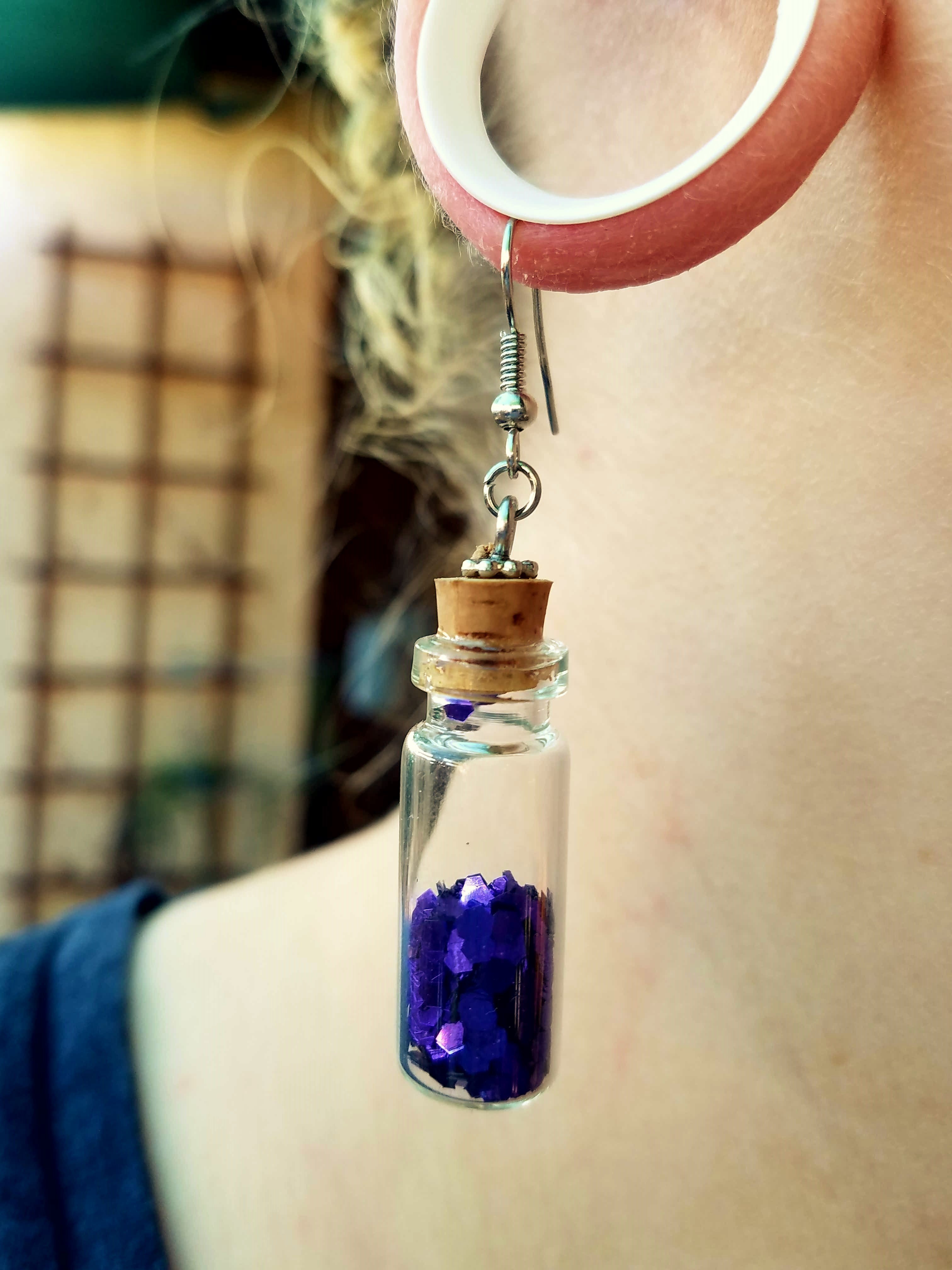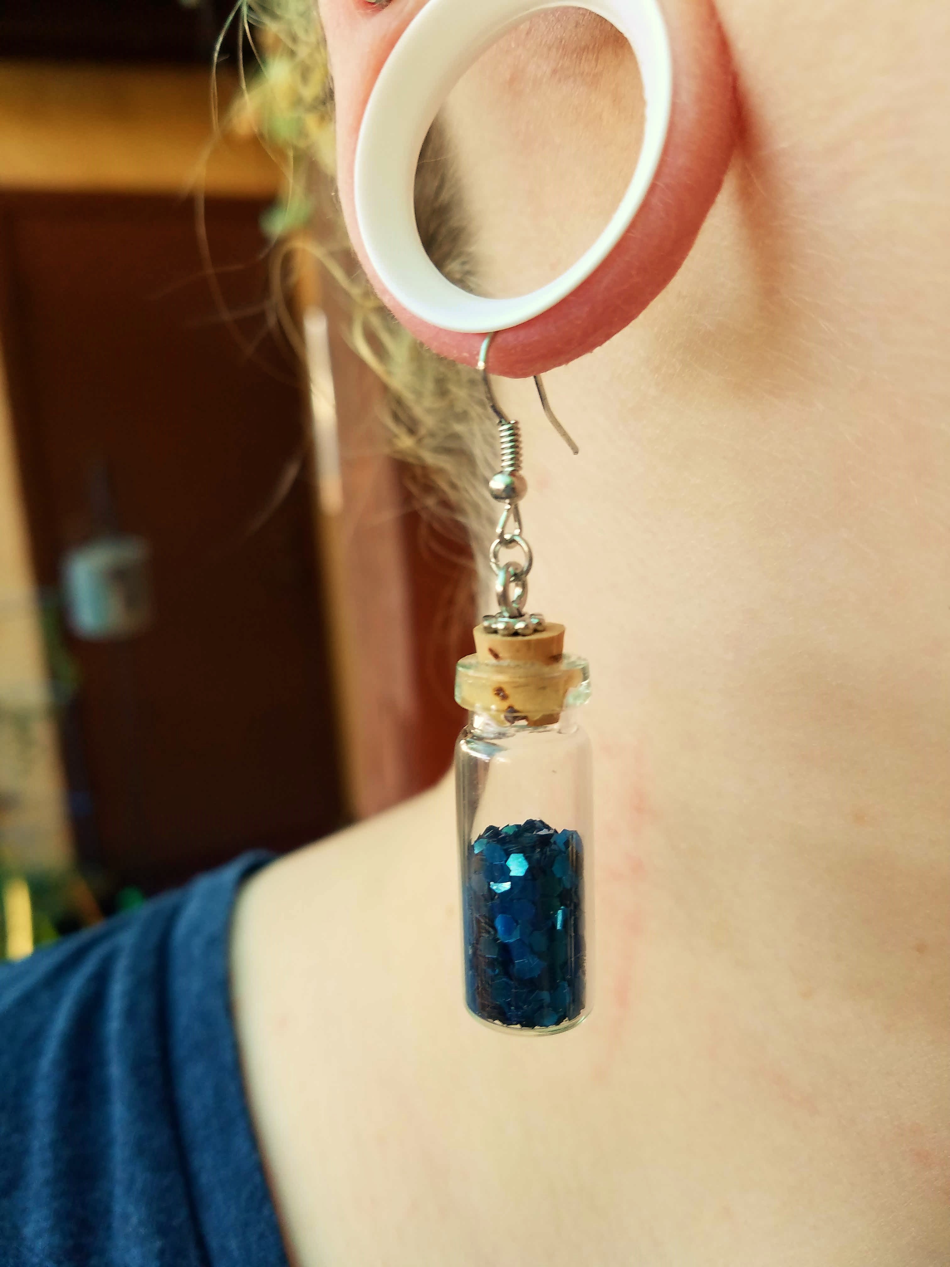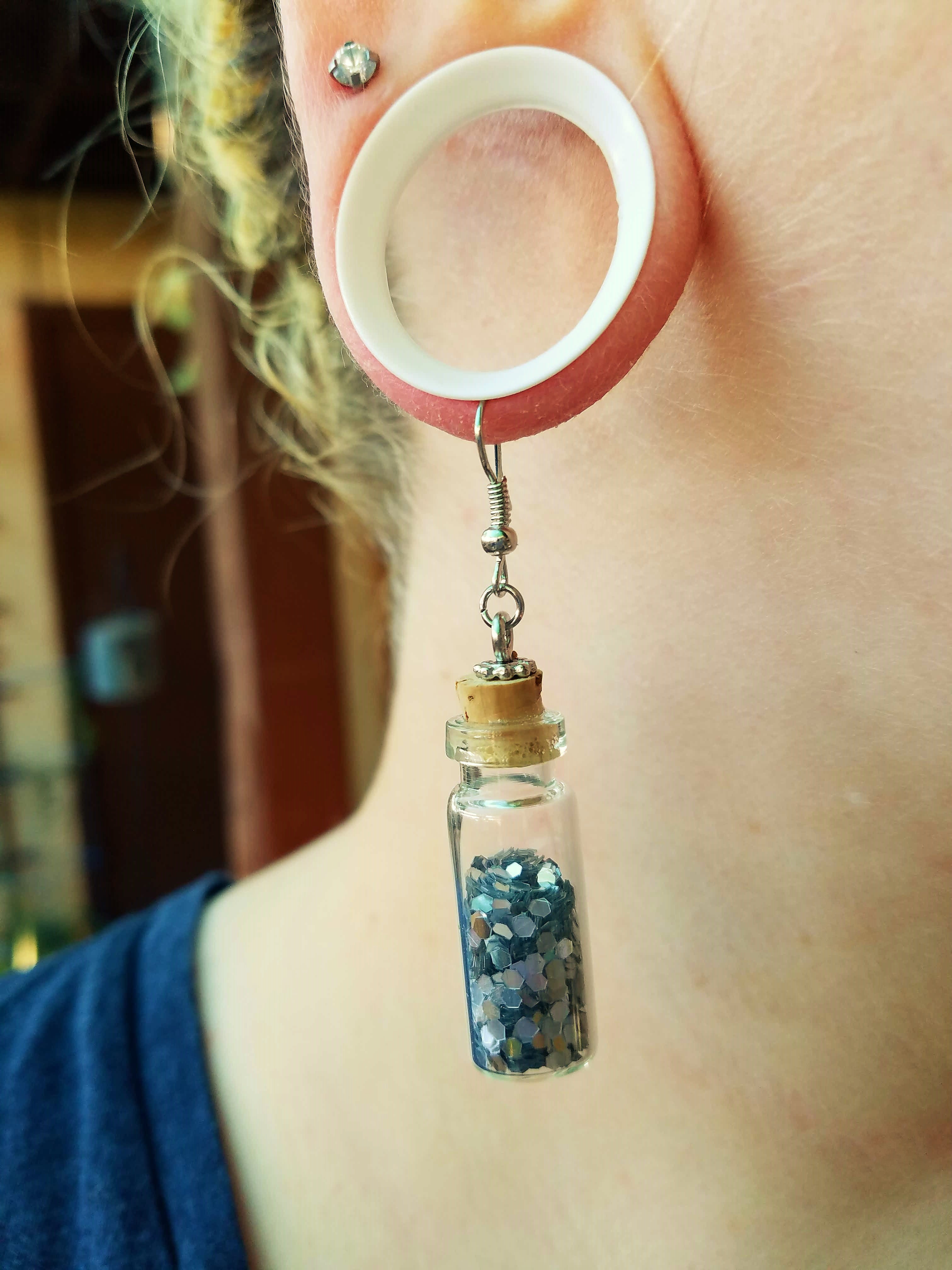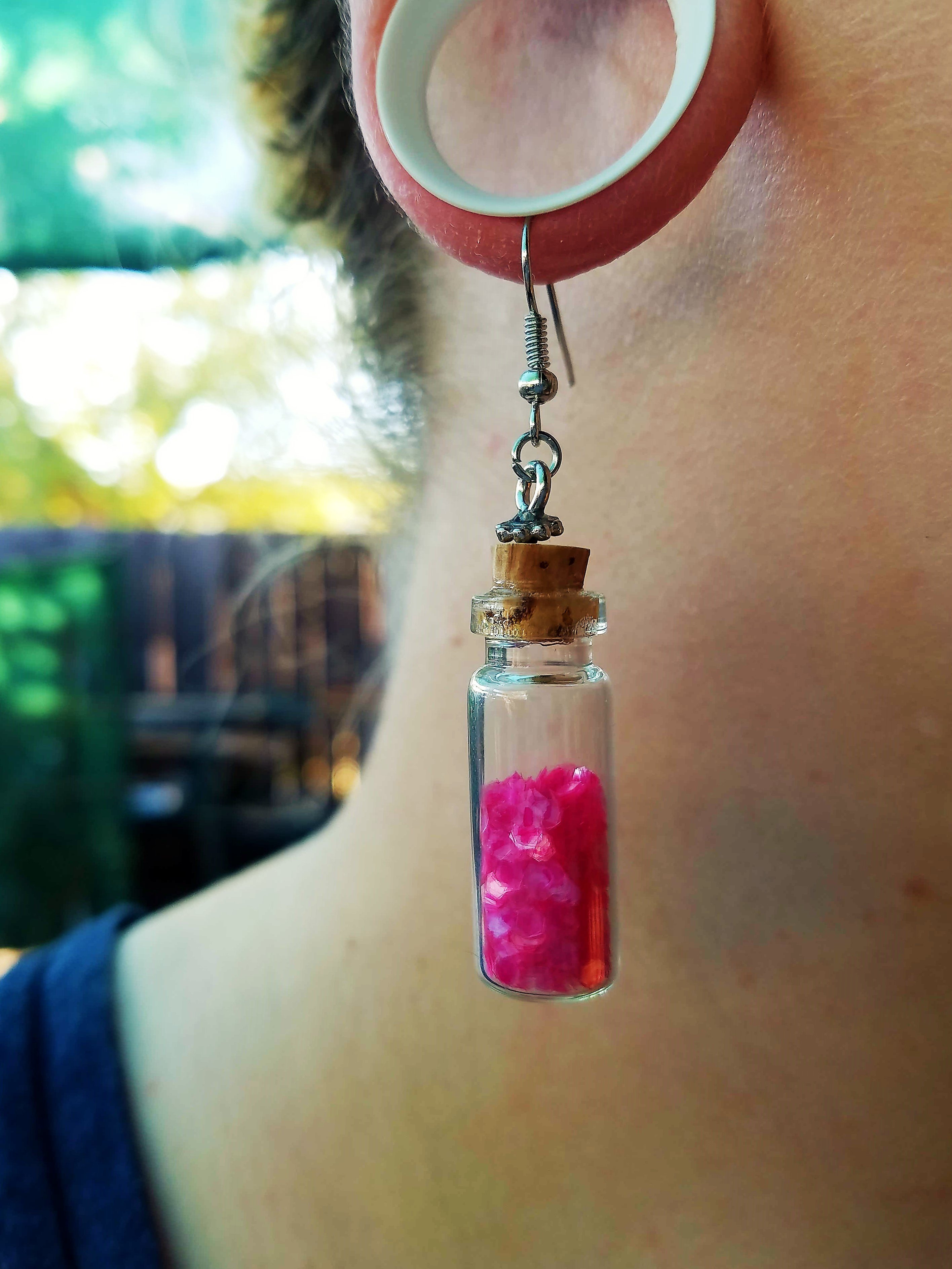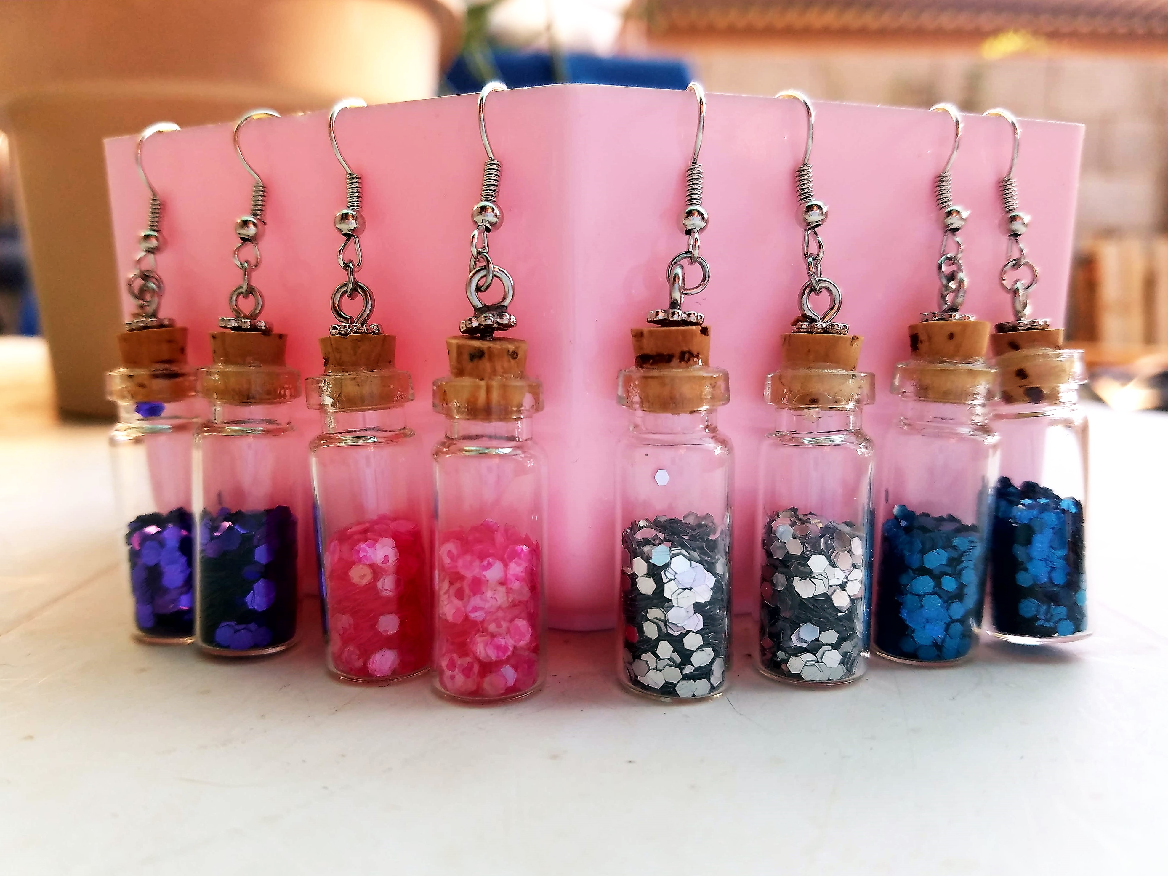 Small glass bottles filled with glitter and secured shut with a cork, hanging on metal fish hooks