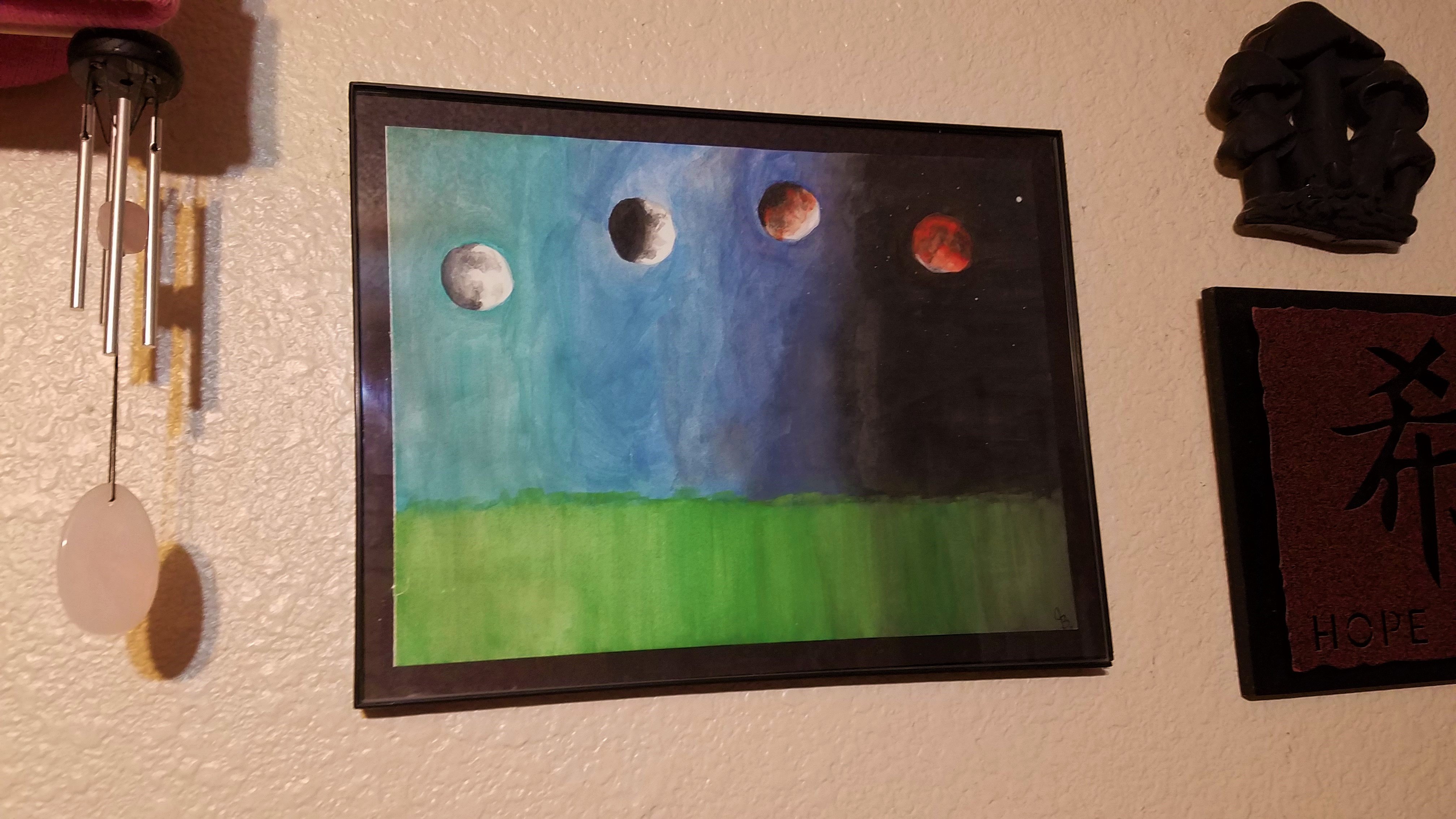 You'll receive a print of my watercolor painting I did of the progression of the blood moon eclipse we saw in April 2014 :) - 9" x 12"