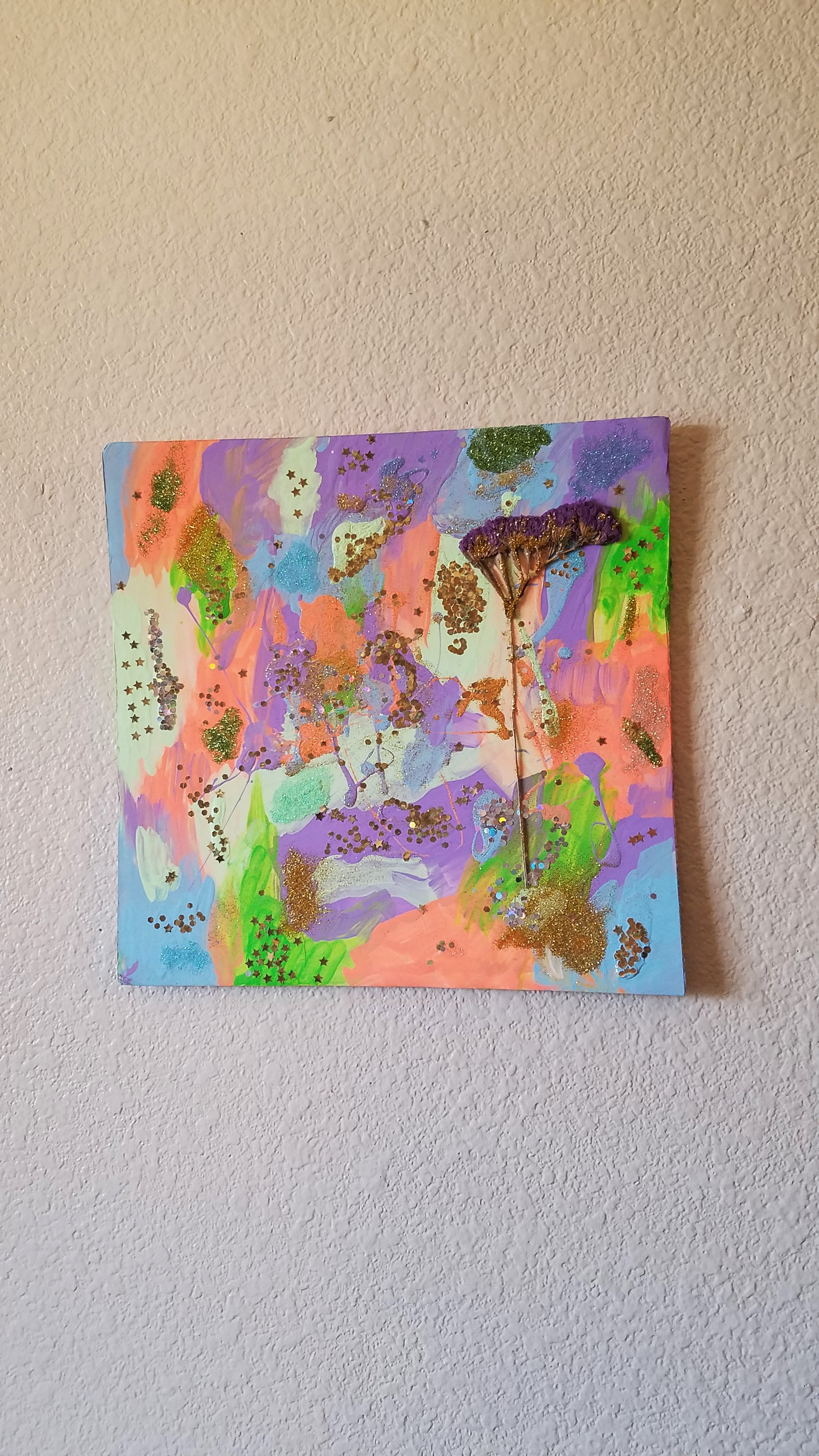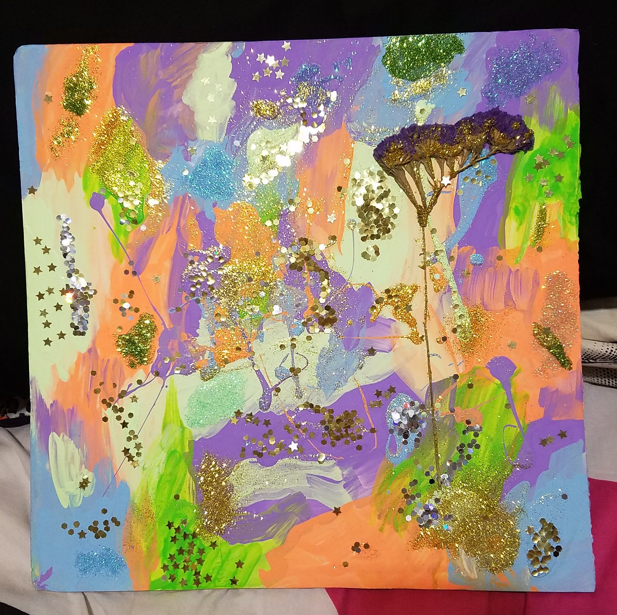 Acrylic, glitter, and dried flowers on foam board - 10" x 12.5" - Purple statice flowers - signed and dated on the back
