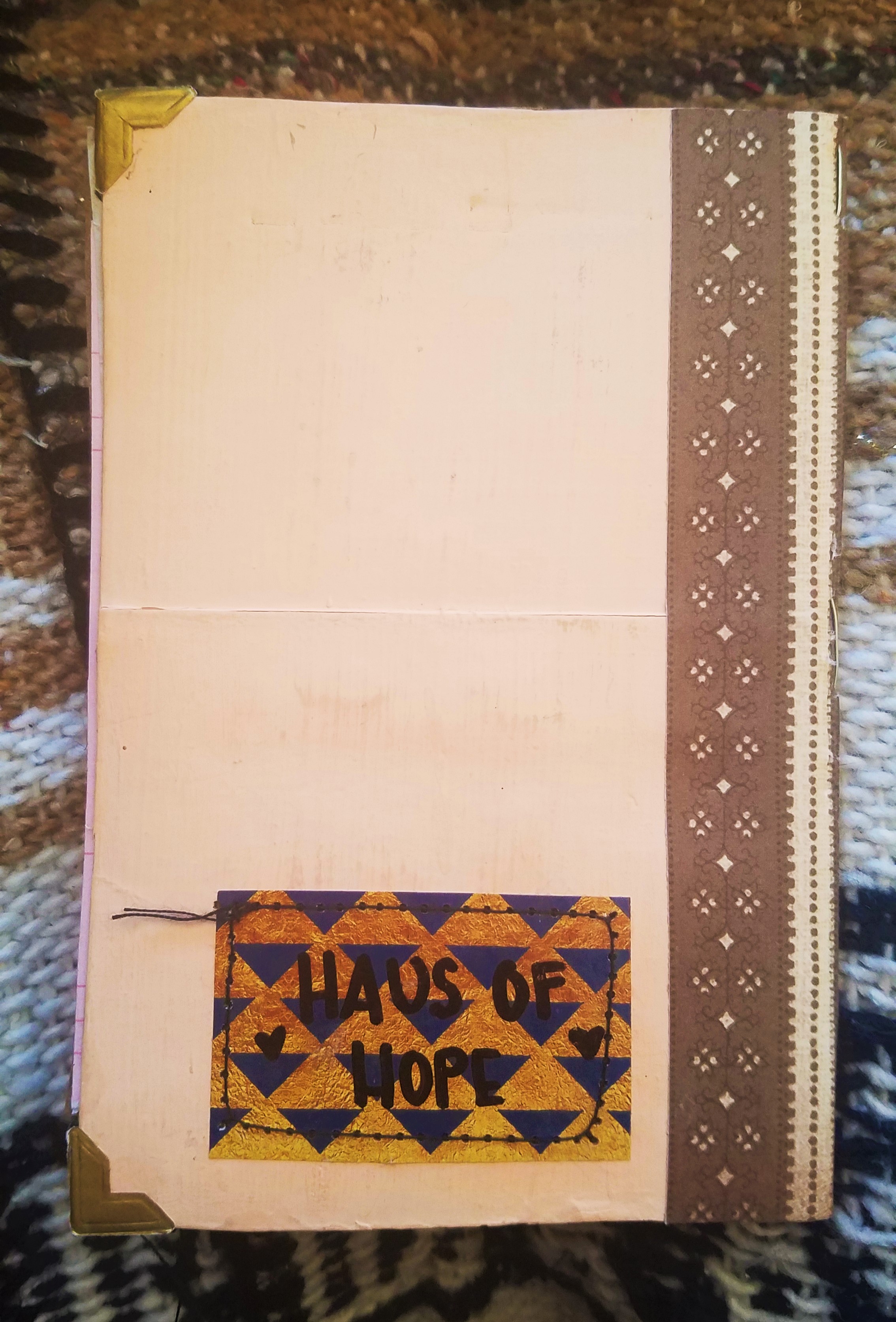 Handmade journal containing different craft papers, book pages, fabric scraps, washi tape, embellishments, stickers, and playing cards!