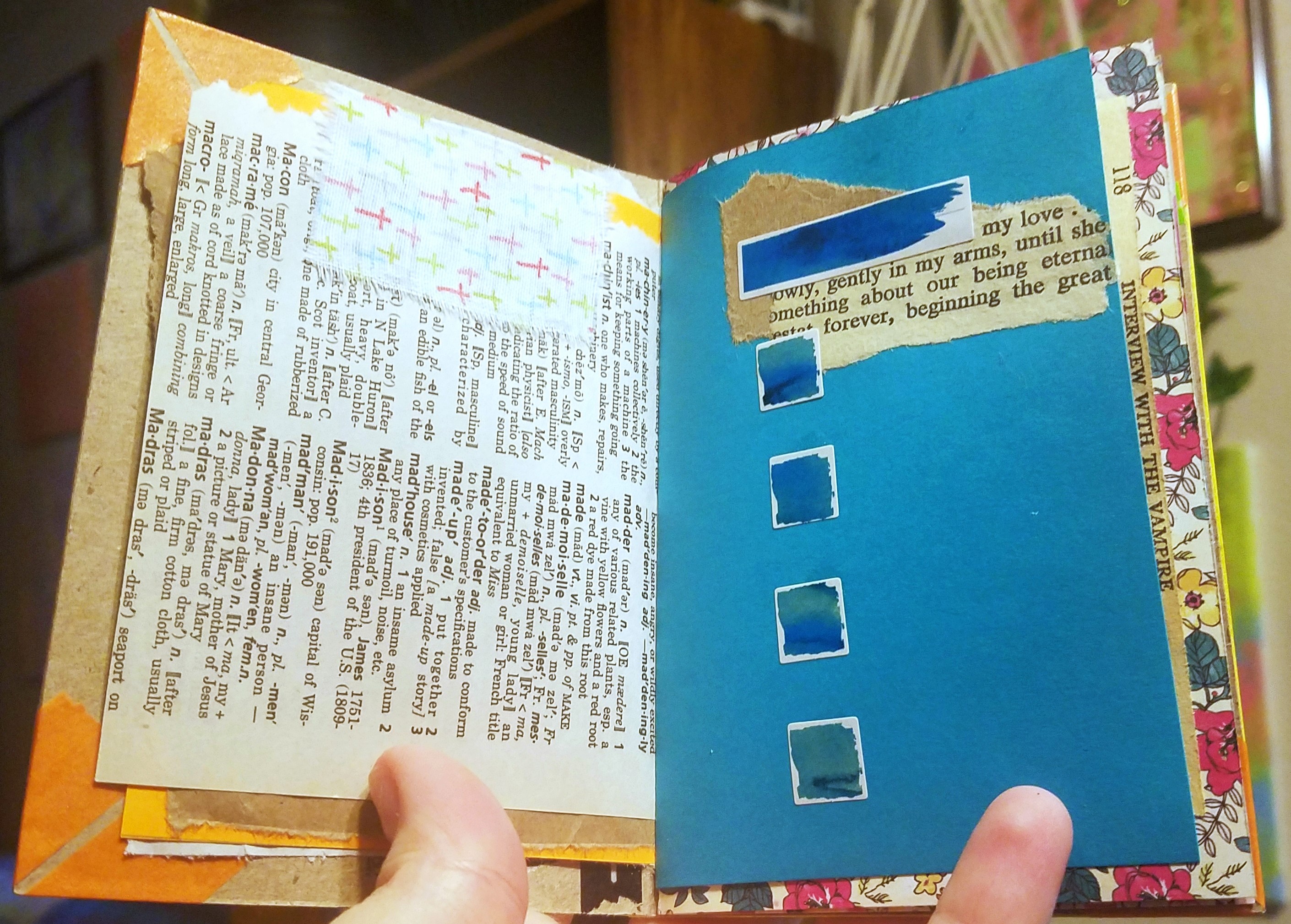 Handmade journal containing different craft papers, book pages, fabric scraps, washi tape, embellishments, stickers, and playing cards! - Features tabs and tuck spots - 20 pages - approx. 3 1/2" x 5"