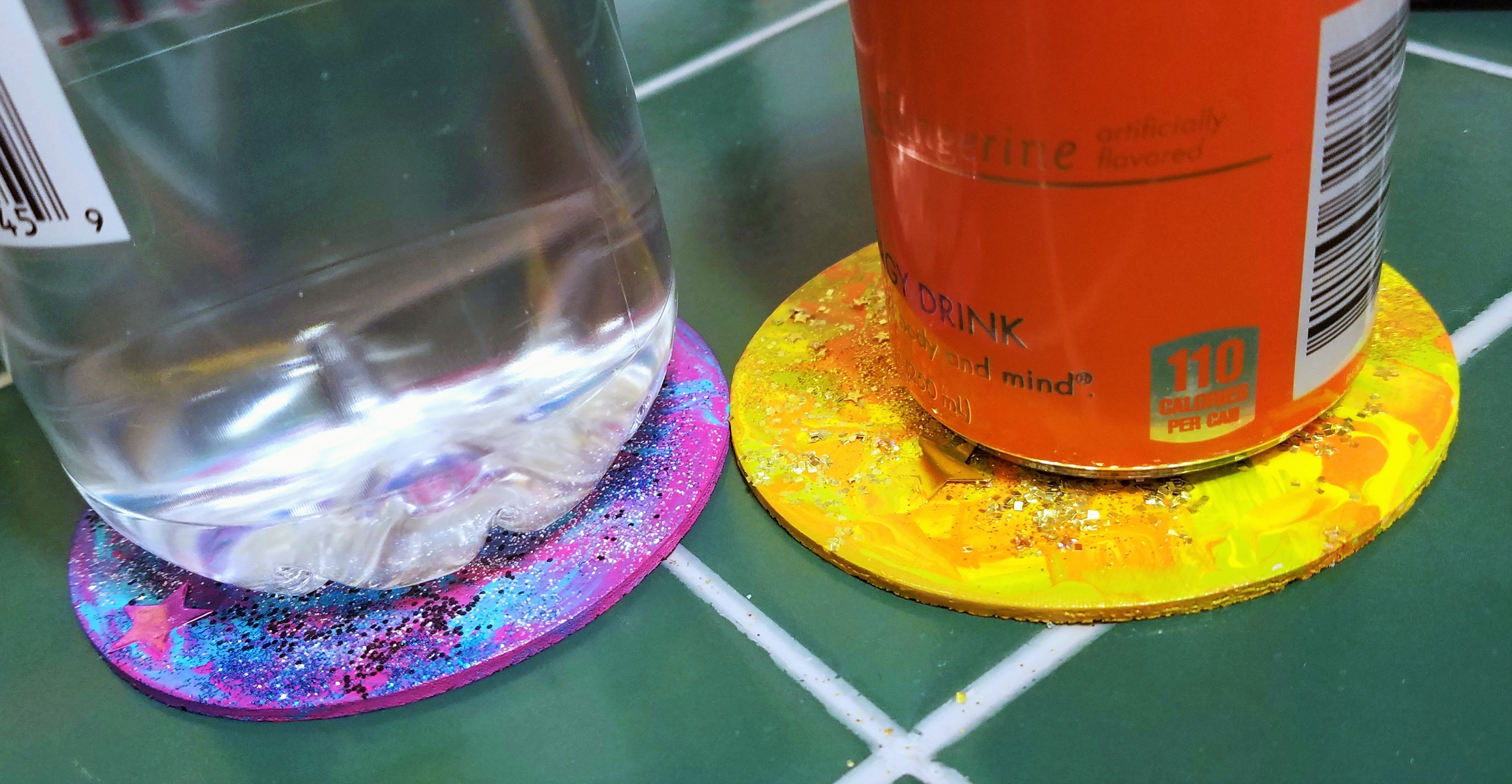 Set your drink on something pretty! Made with acrylic paint and glitter. Various colors available, choose from the drop-down menu!