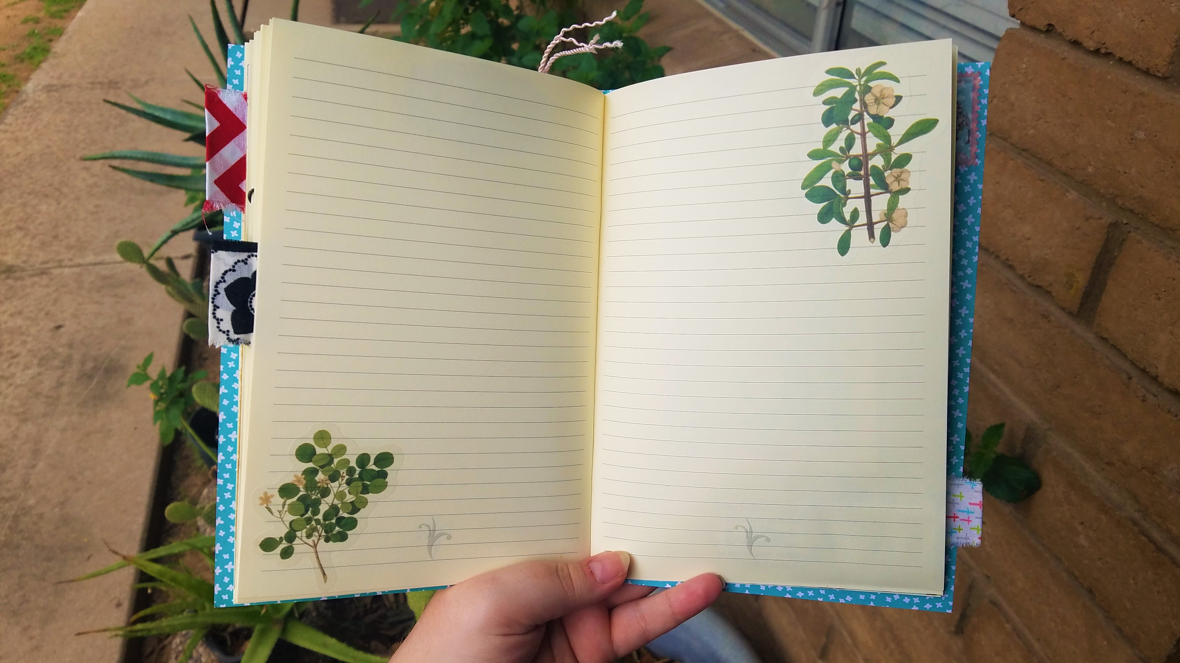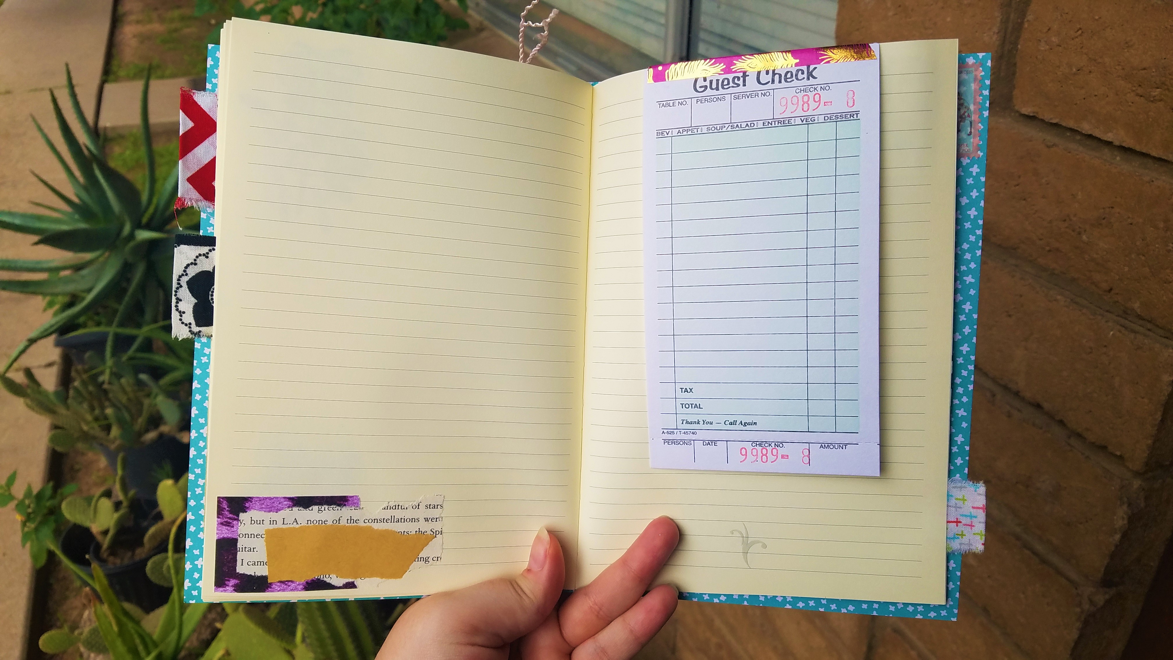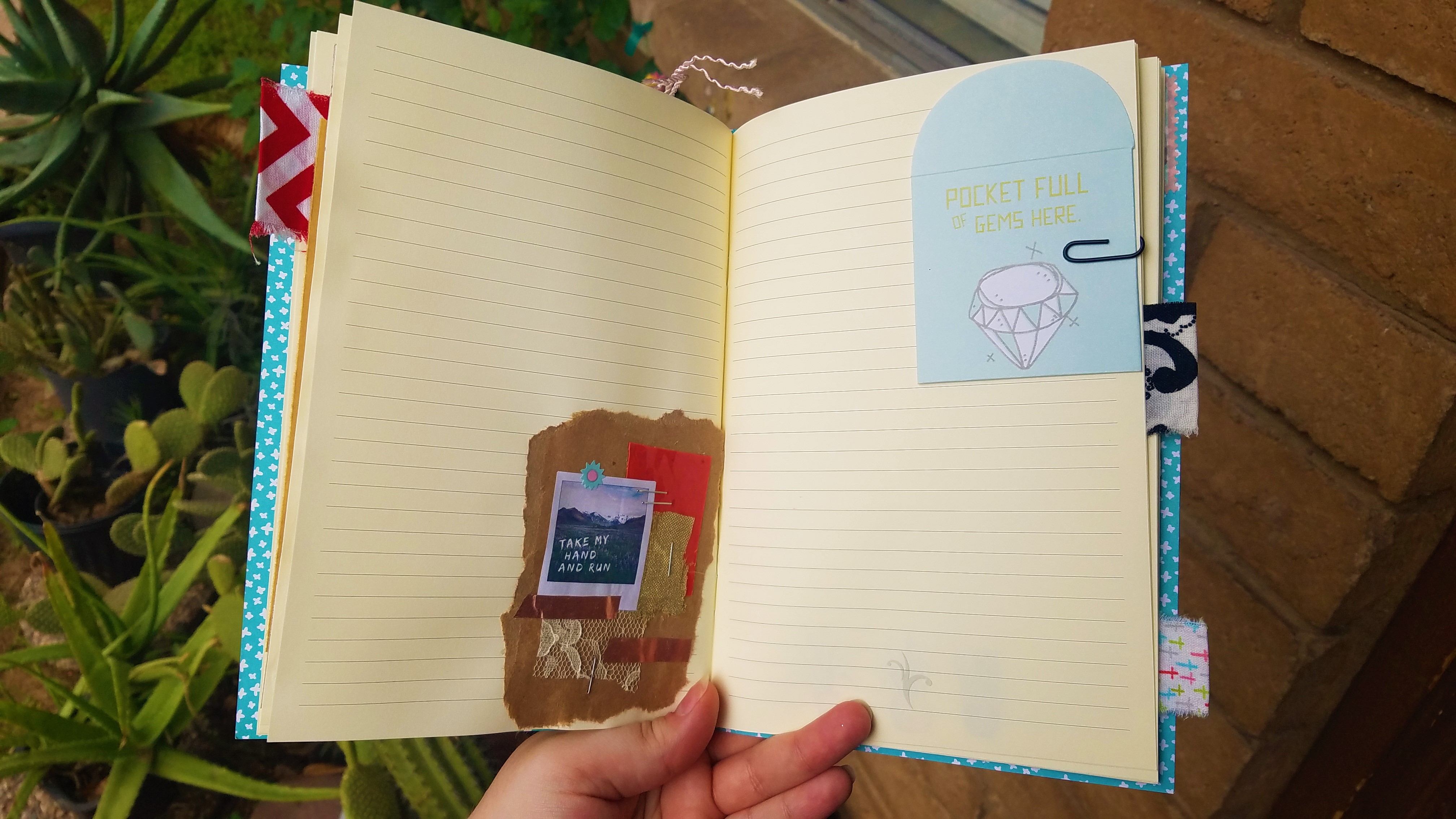Handmade journal containing lined paper, pockets, fabric scraps, washi tape, embellishments, stickers, tabs, and more! - 15 sheets/30 pages - approx. 6" x 8 1/2"