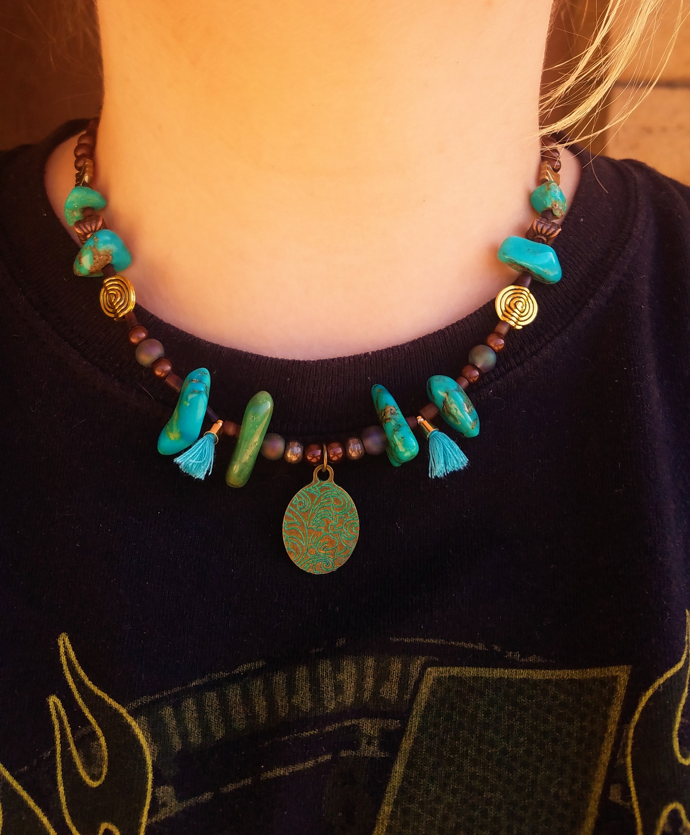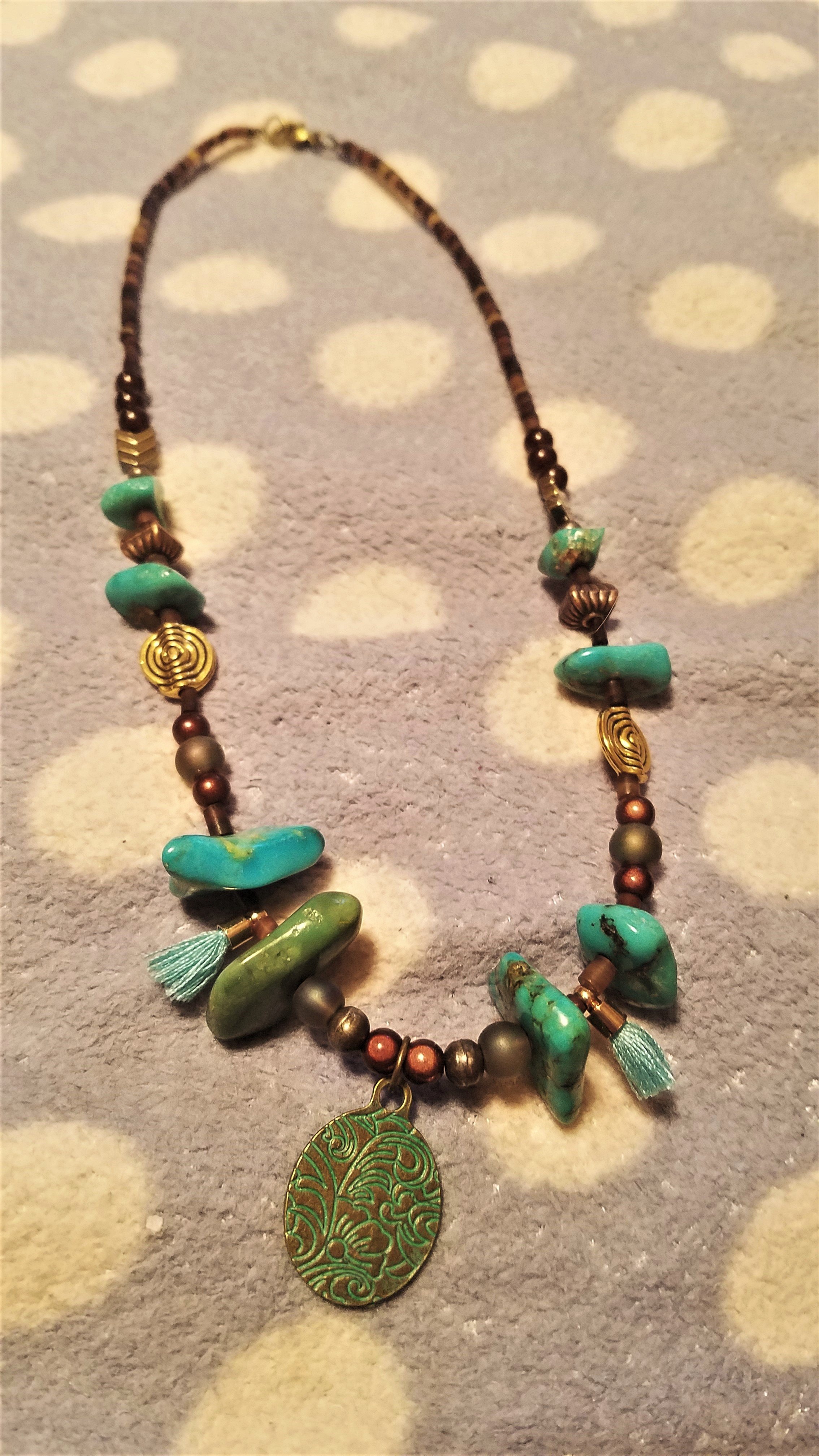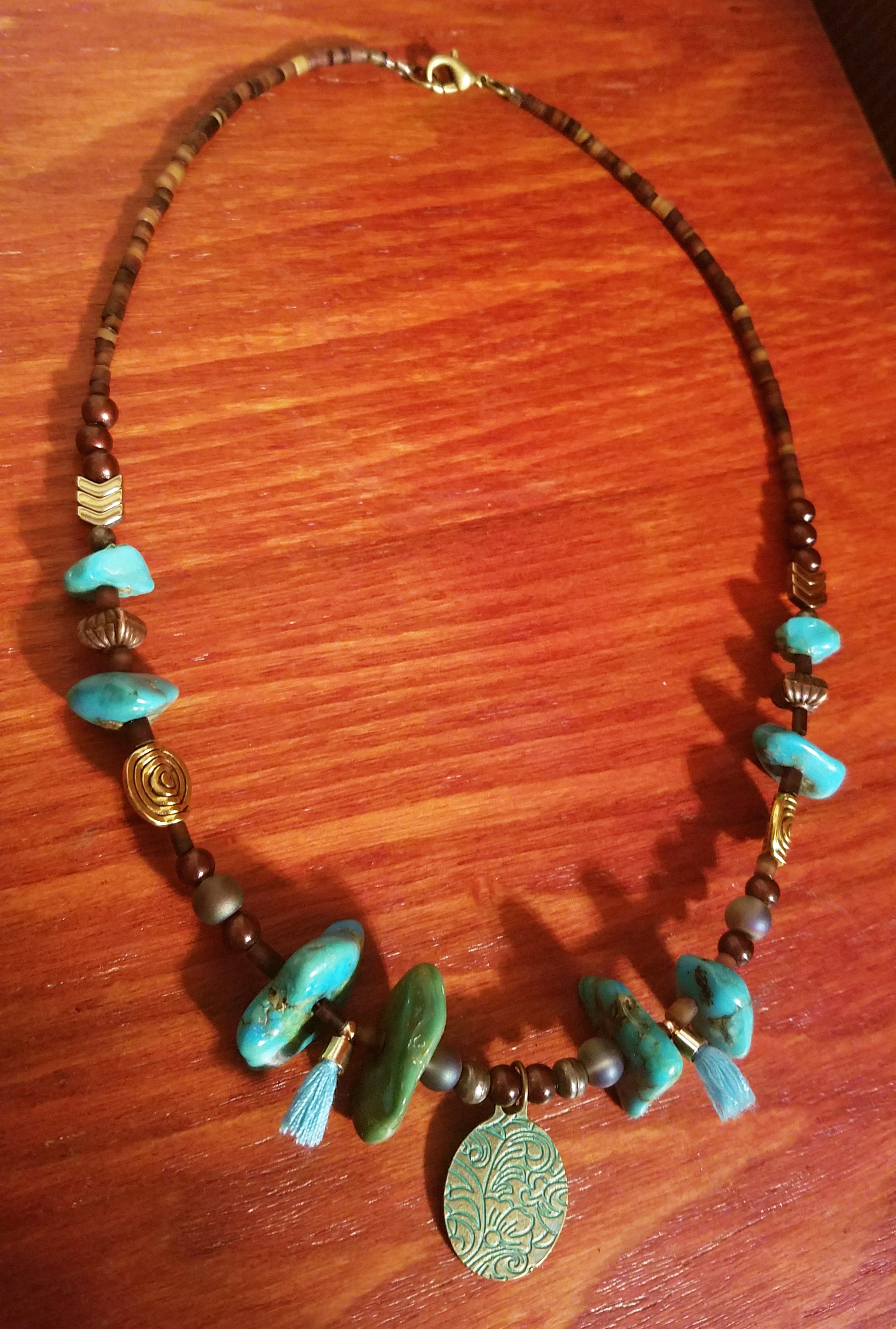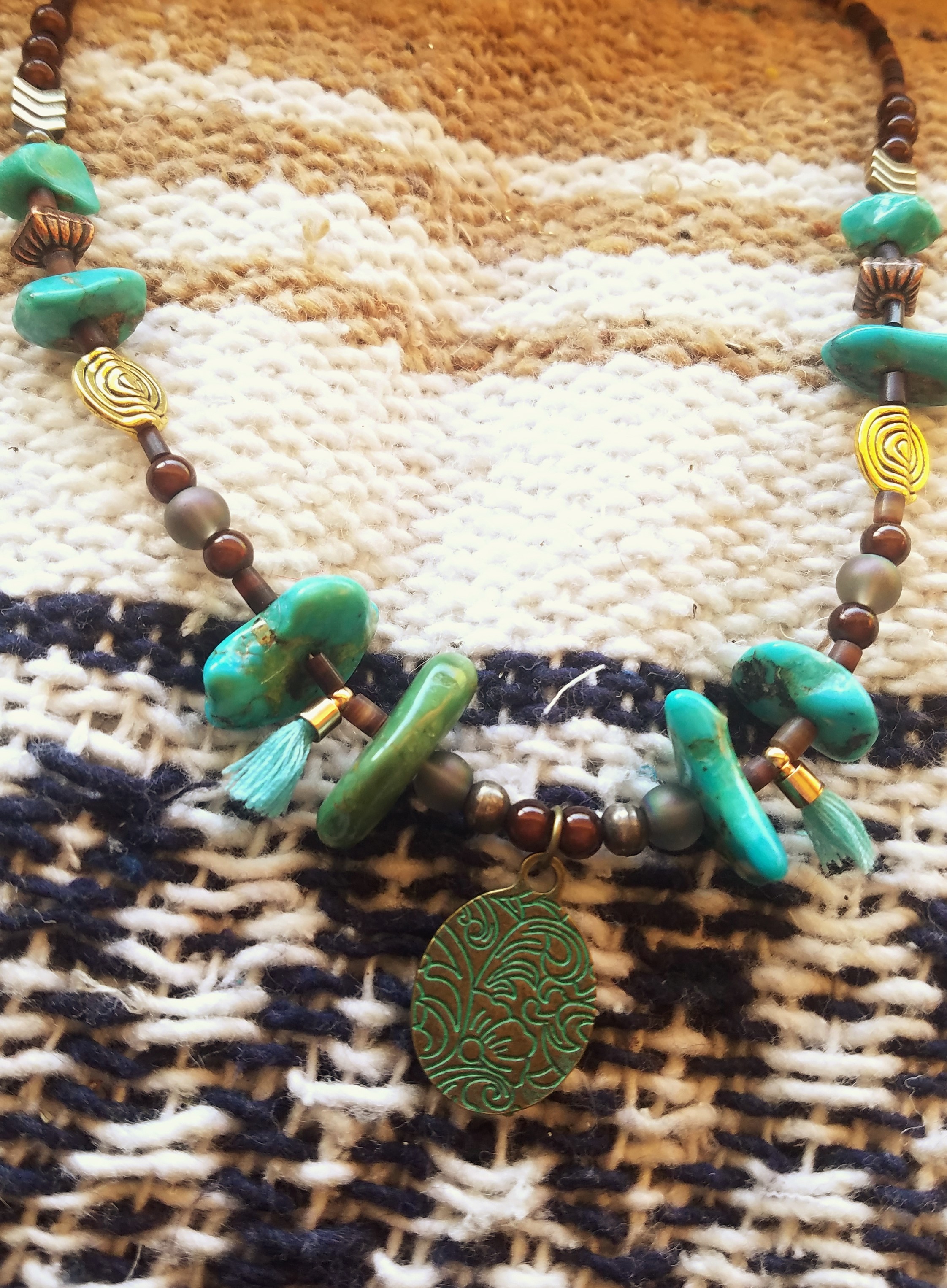 Mega cute necklace featuring REAL turquoise stones, REAL turtle shell beads, mini tassels, and a metal pendant, all in brown and teal shades! - 17 1/2" long - pendant: 3/4" long - lobster claw clasp