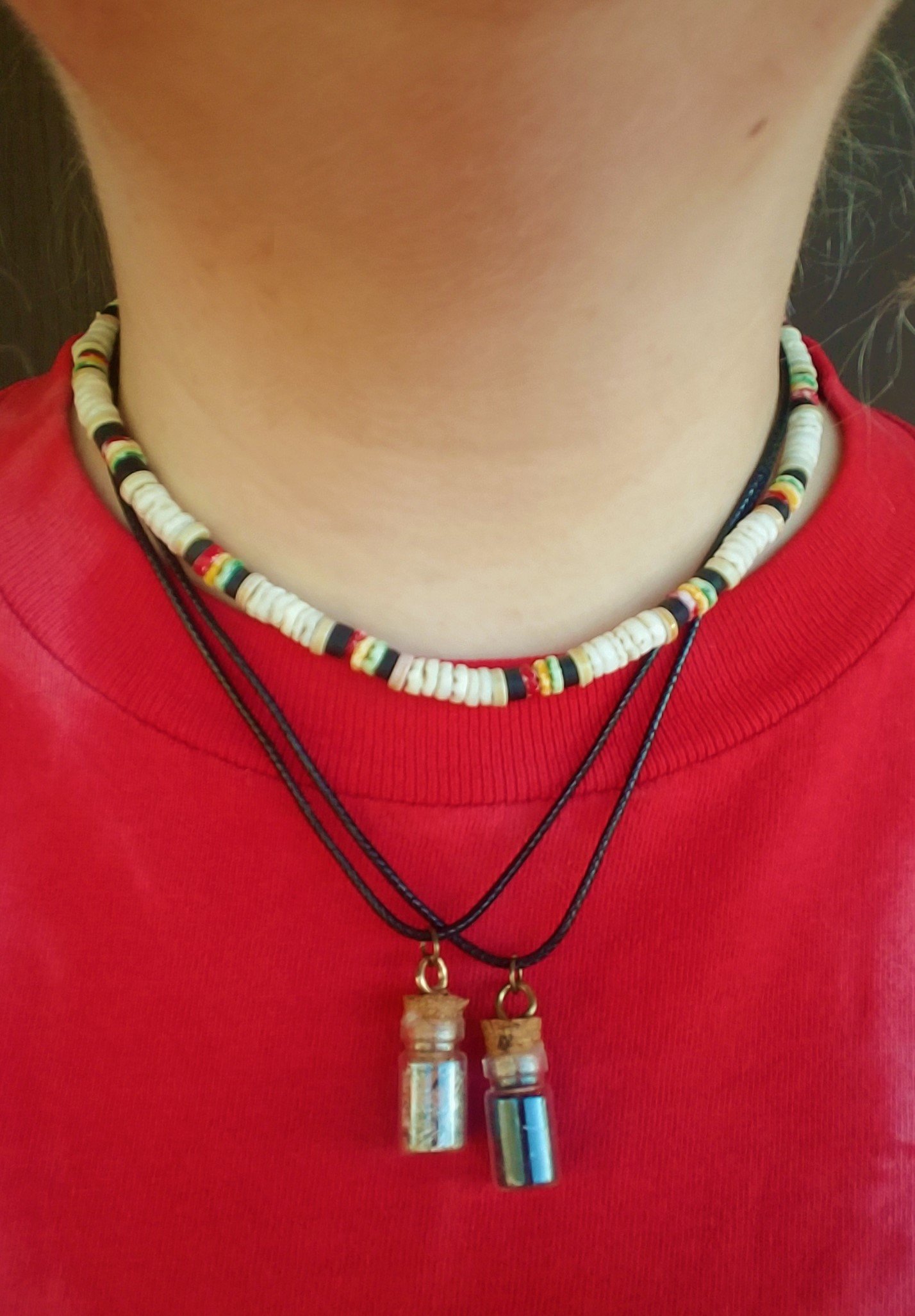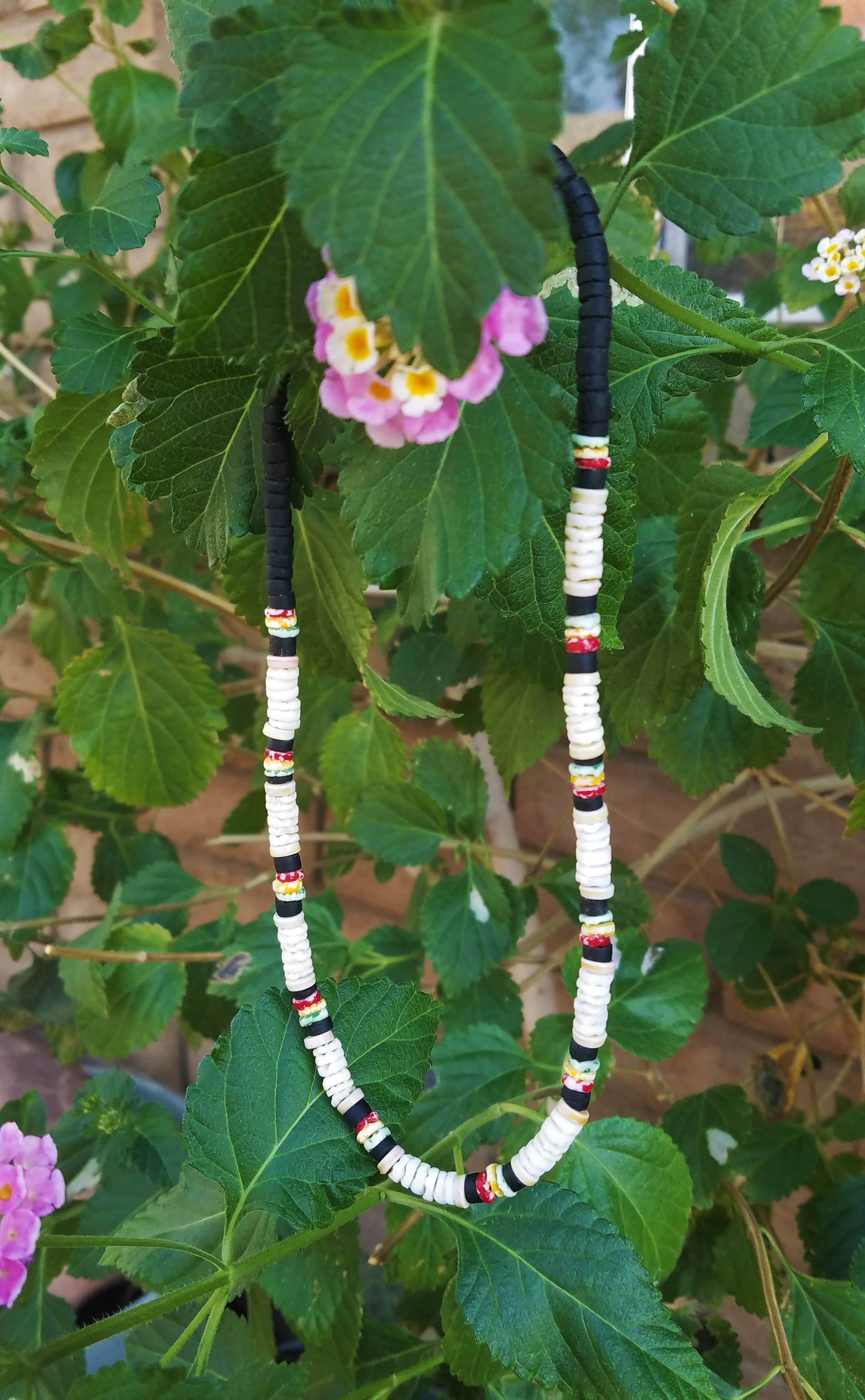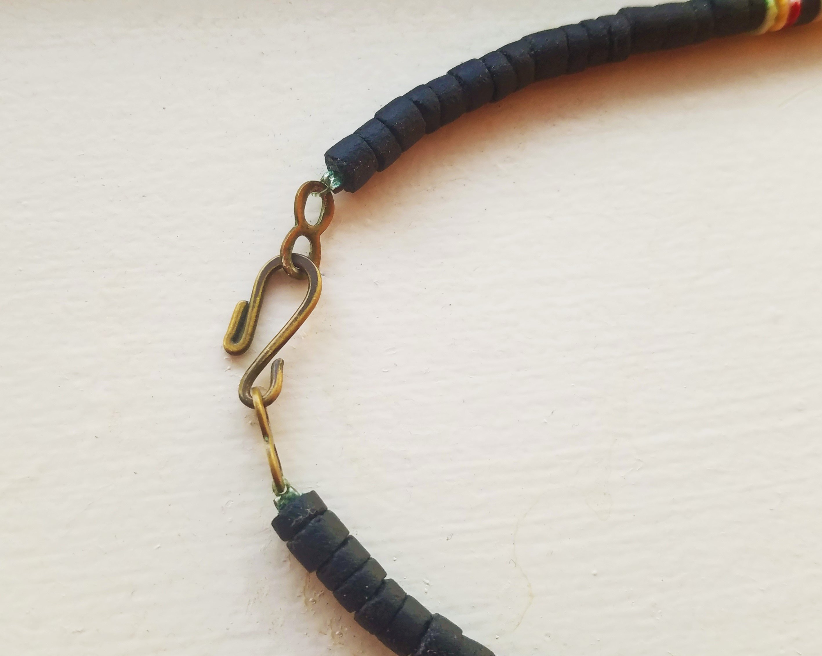 Short beaded necklace on jewelry wire made with authentic vintage beads of black, white, red, yellow, and green! - Approx. 16 3/4" long - Closes with a gold S-hook clasp