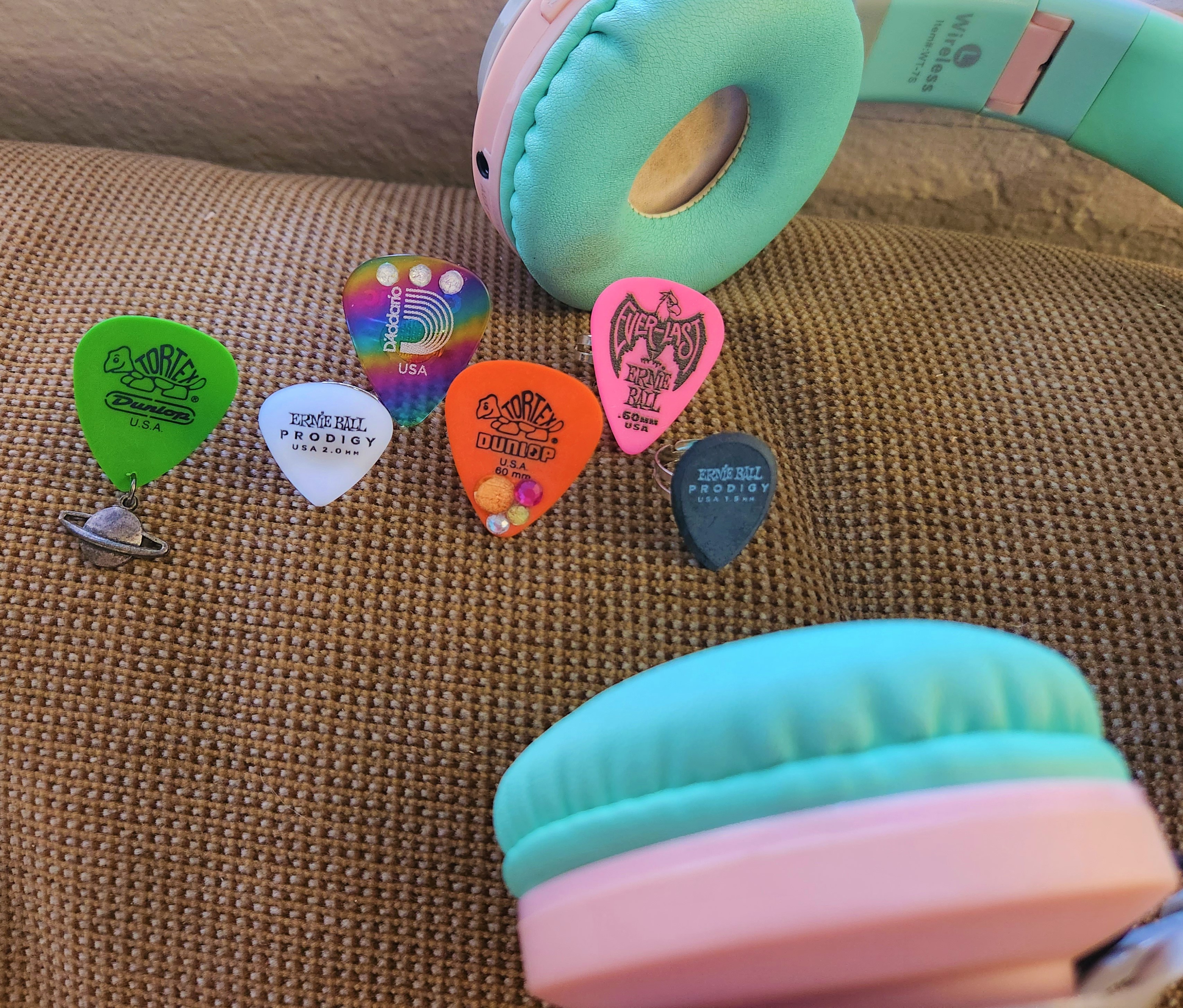 - Green Dunlop pick with Saturn charm - 1 1/2" long (with charm)