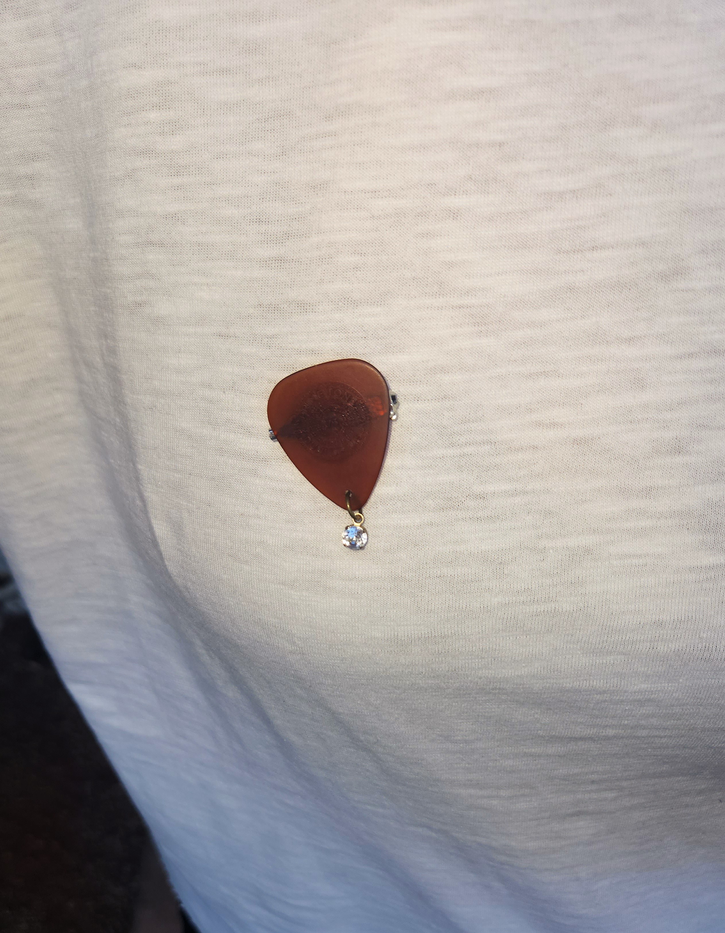 You can carry the music with you wherever you go with these guitar pick pins! Choose from the drop-down menu! - Purple Dunlop pick with tassel - 1 3/4" long - Brown Dunlop pick with gem - 1 1/4" long
