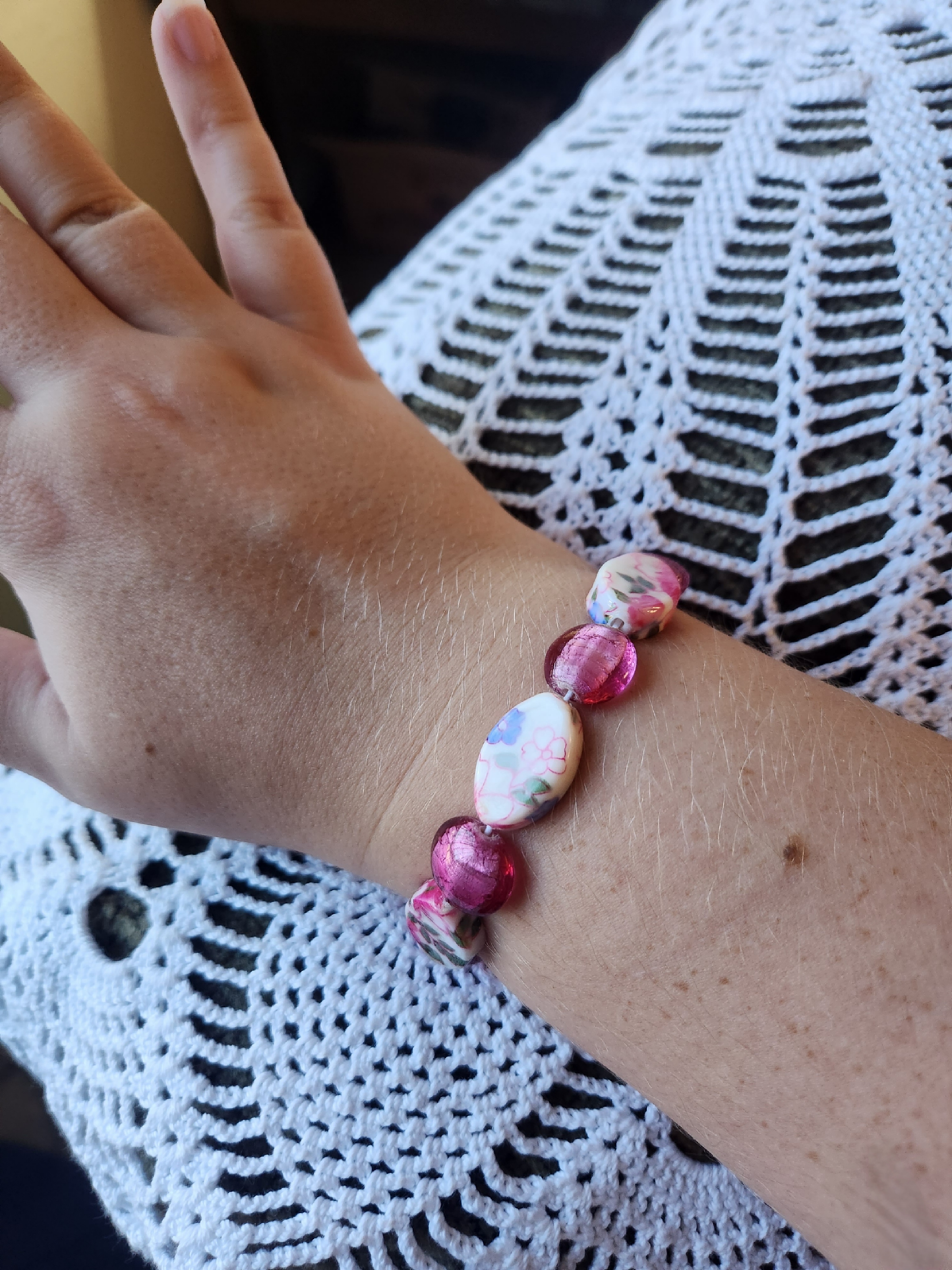 Stretchy bracelet with pink glass beads and pink, white, and blue floral glass accent beads ๐ธ - approx. 7" long before stretching