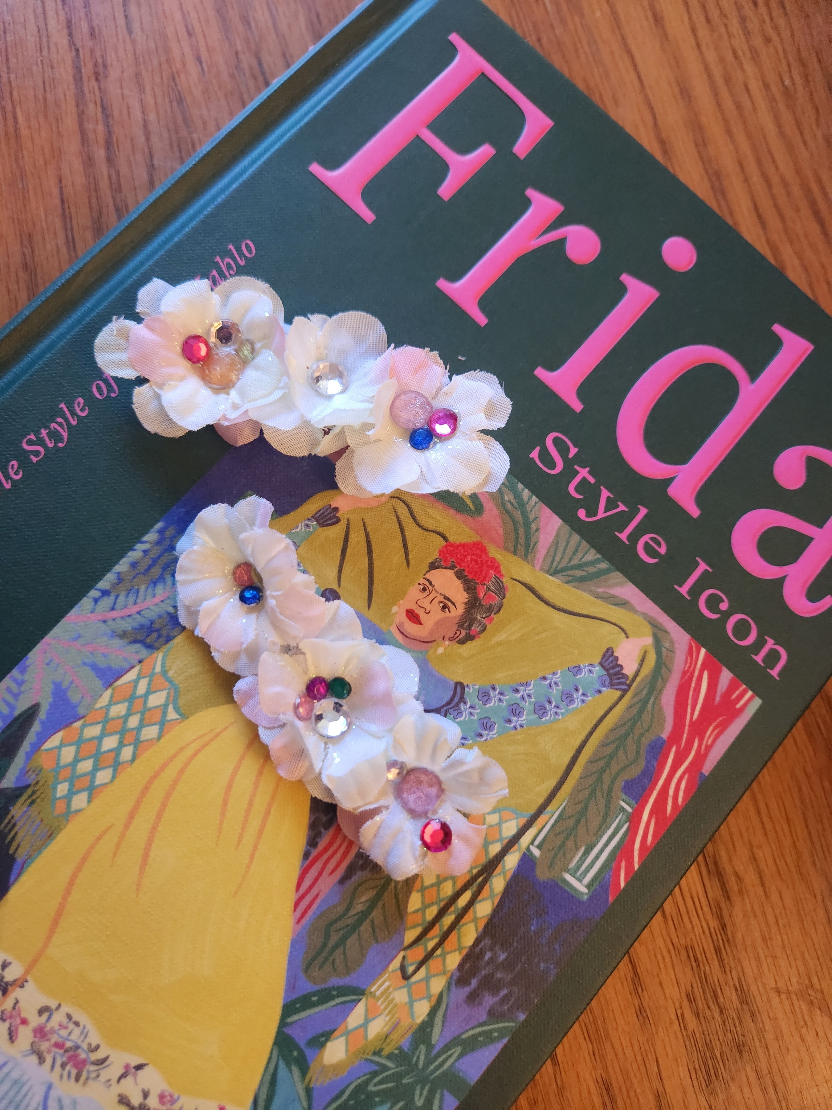Two barrettes featuring fabric flowers with gem centers and just a dash of glitter โจ - approx. 2 3/4" long each