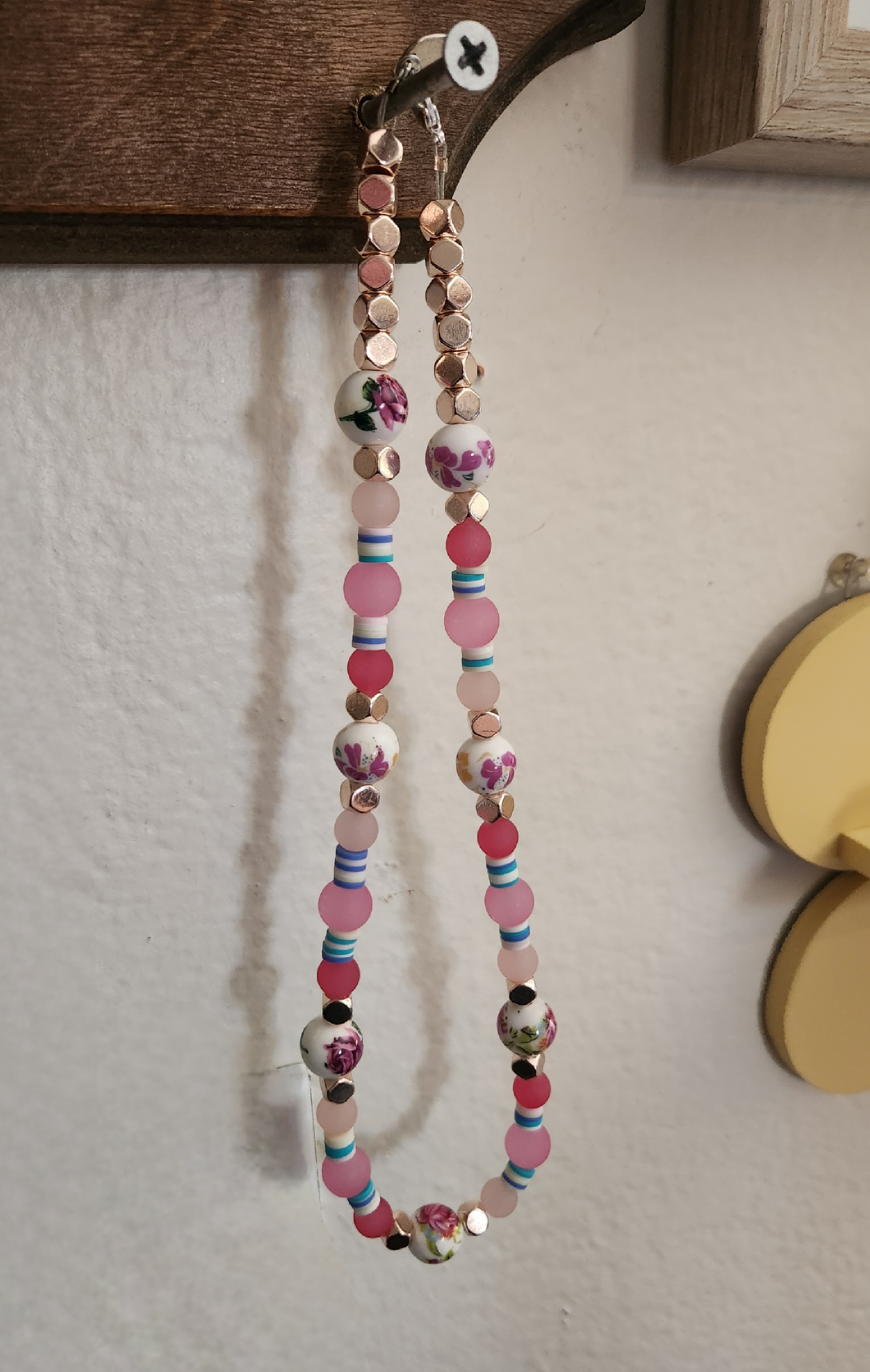 Barbieland vibes! Beaded necklace with pink glass beads, blue and white clay disc beads, floral glass beads, and rose gold geometric beads on jewelry wire - approx. 18 1/4" long