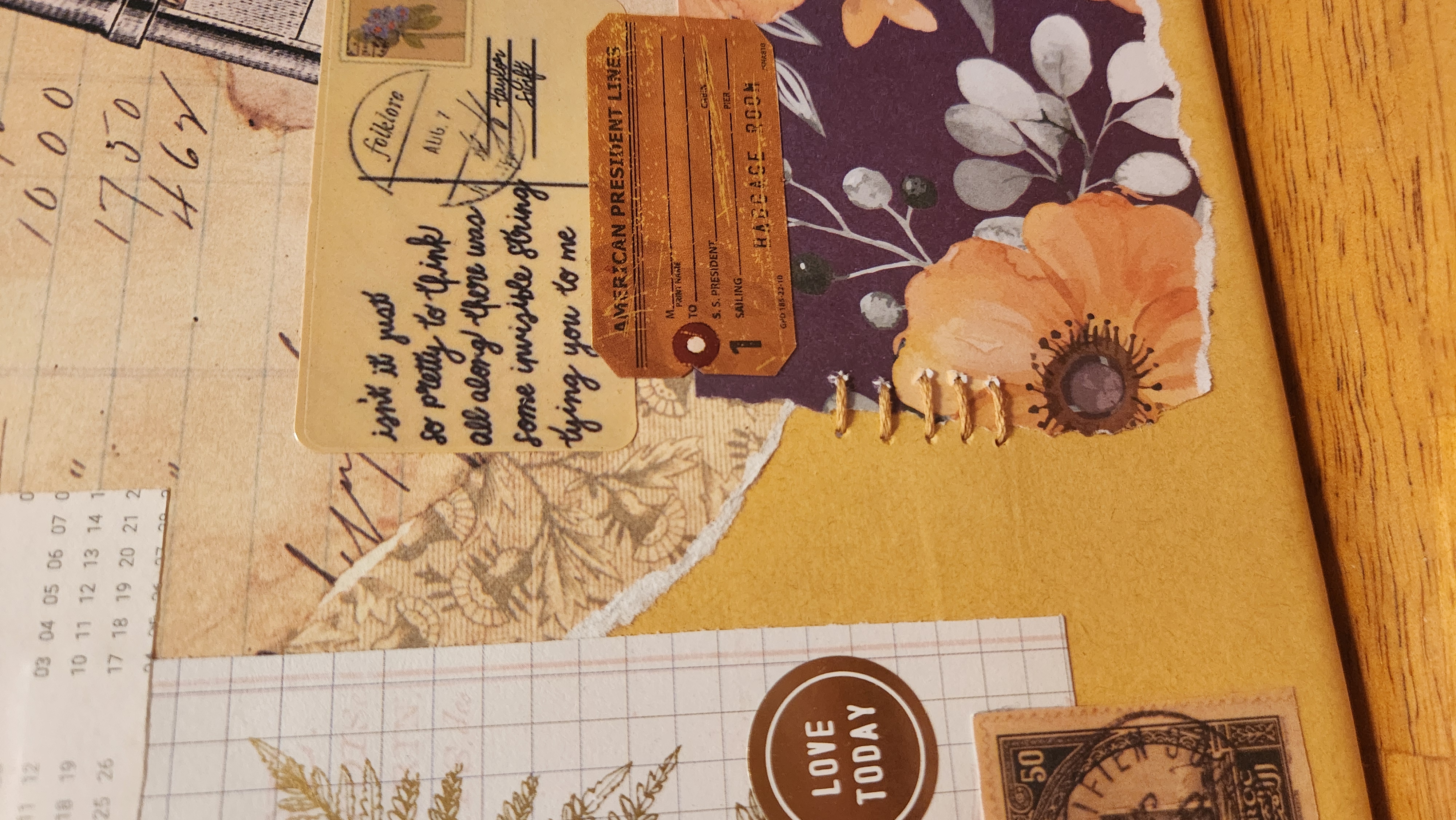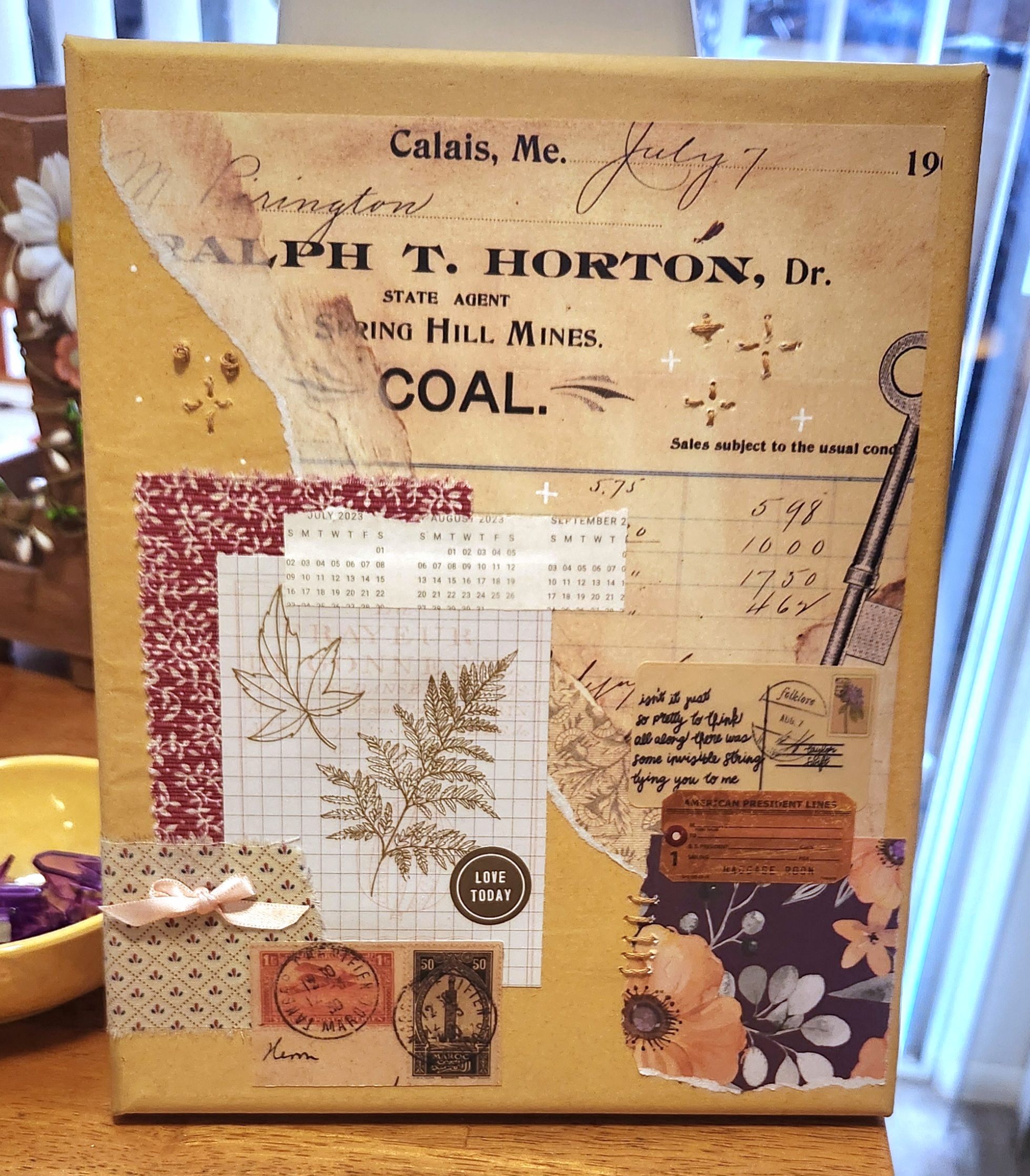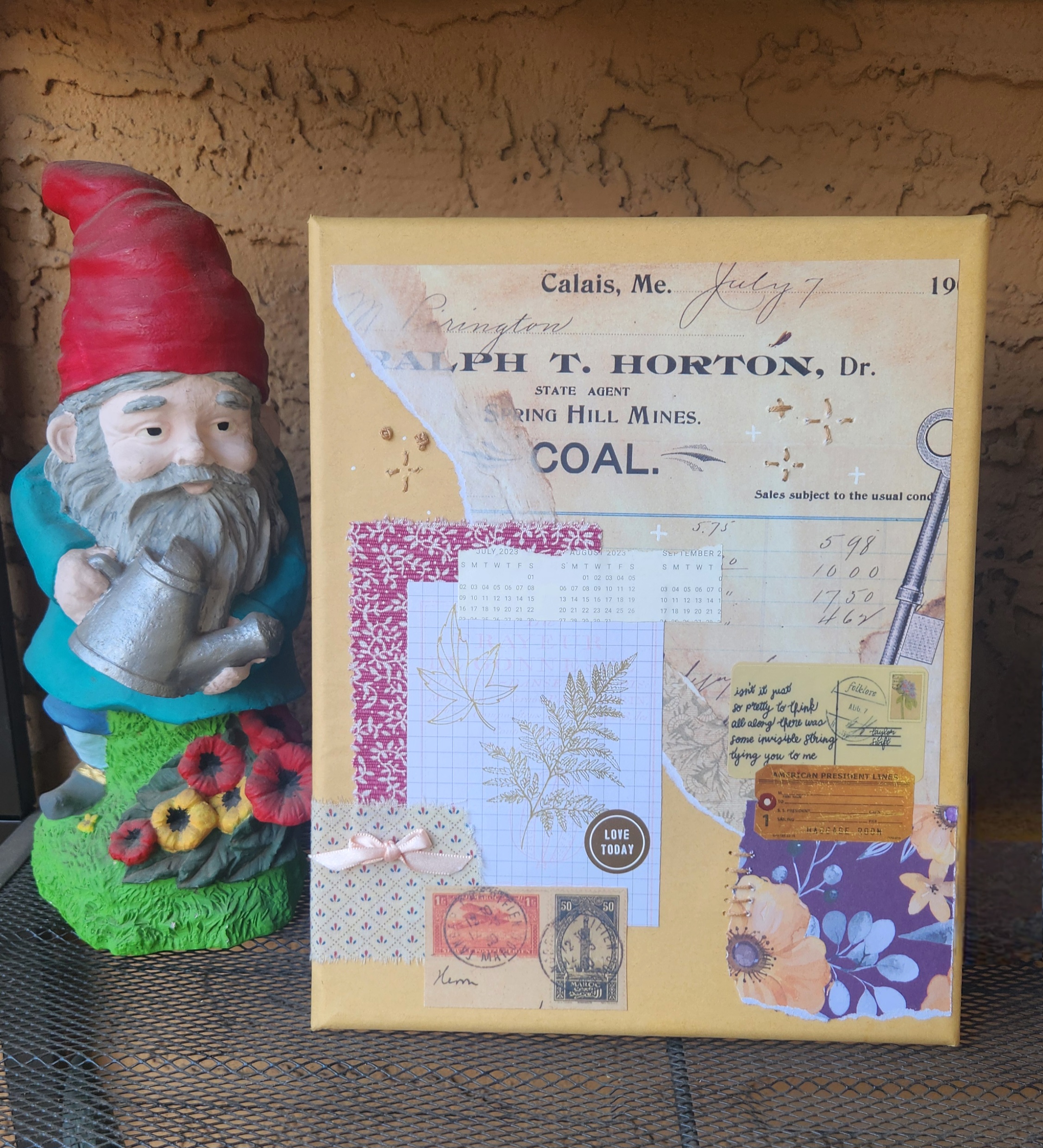 Original mixed media collage art feauring paper, fabric, stickers, emroidery, and rub-on transfer on canvas - 8" x 10" - signed and dated on the back