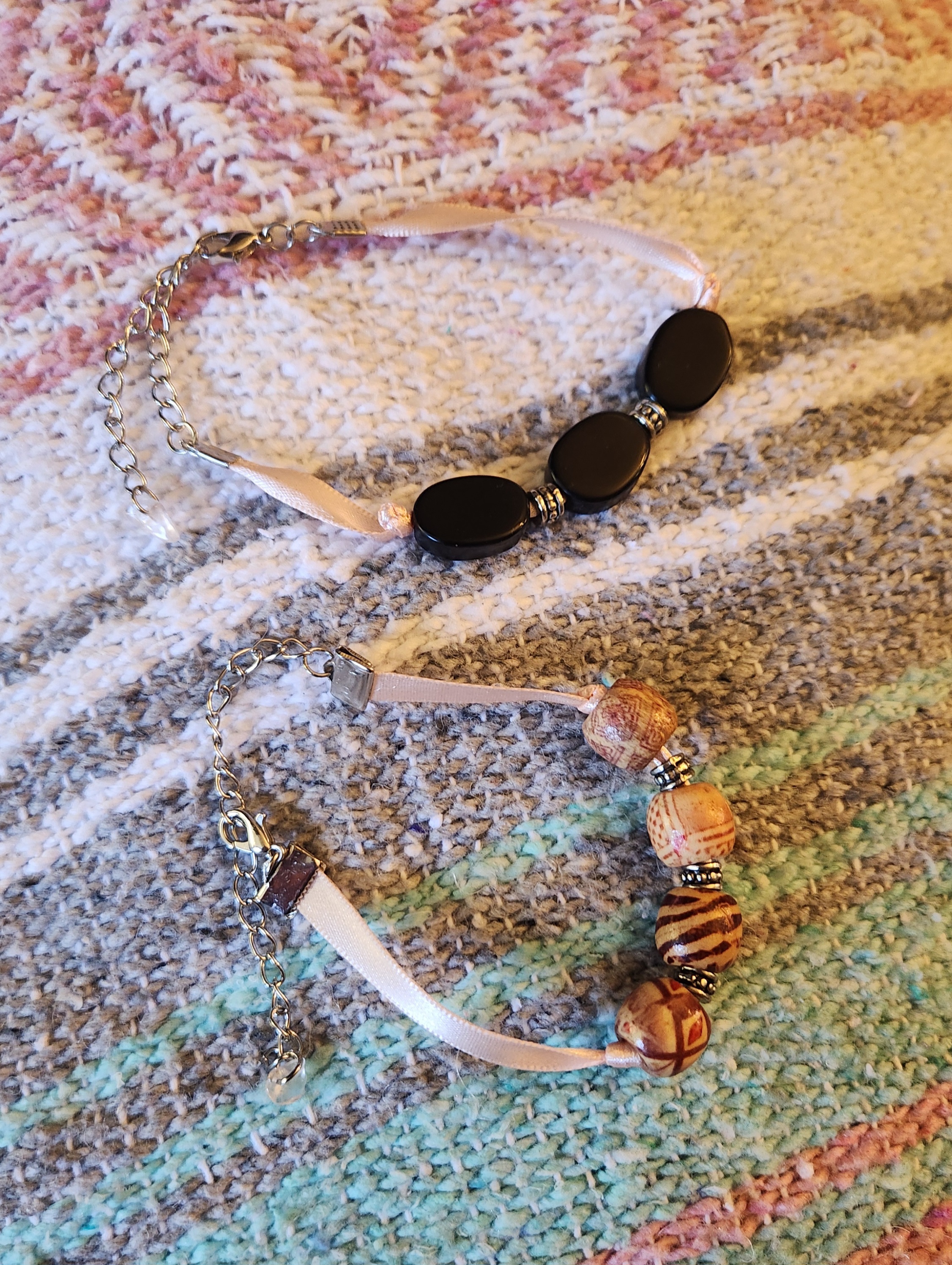 Two bracelets each made with pink ribbon, beads, and crystal chips