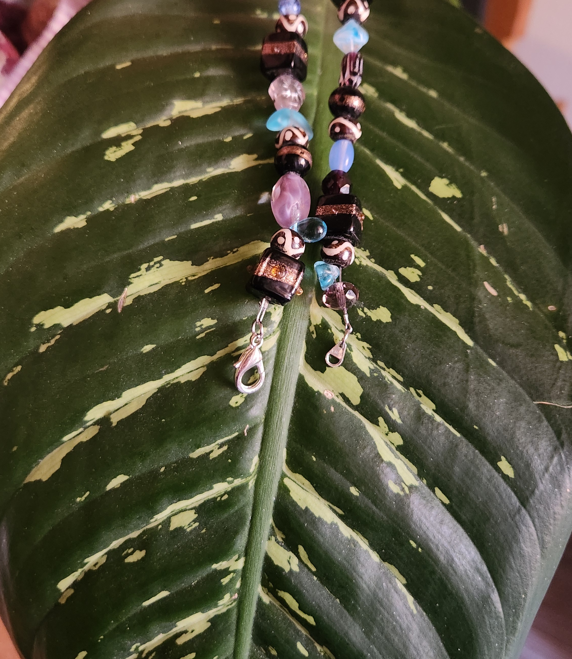 Beaded necklace with blue, purple, black, and gold glass and acrylic beads and a clear quartz crystal pendent - approx. 19" long - pendent: 2" long
