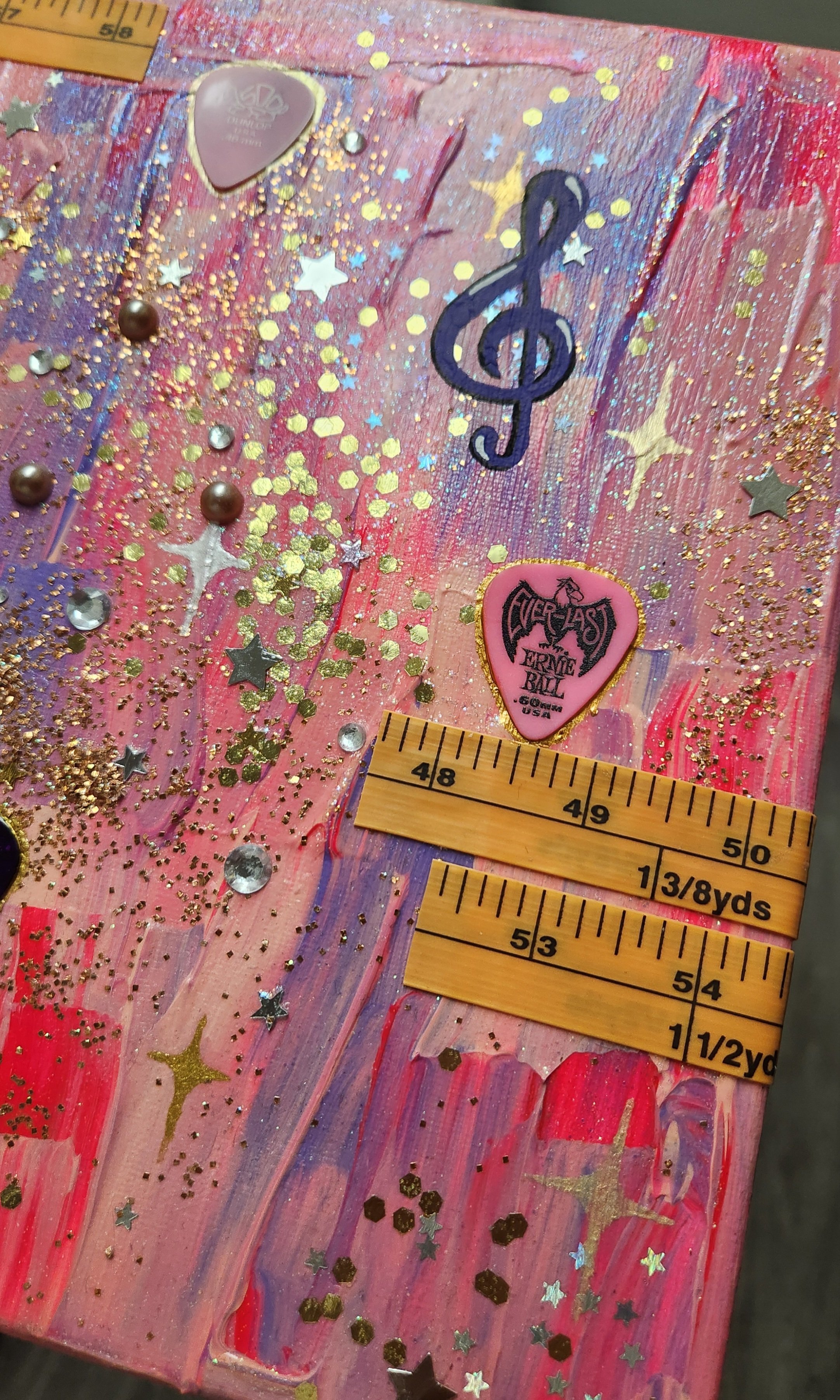 - Acrylic, paint pens, metallic watercolor, glitter, real pieces of measuring tape, real guitar picks, iridescent glitter spray, and gloss medium