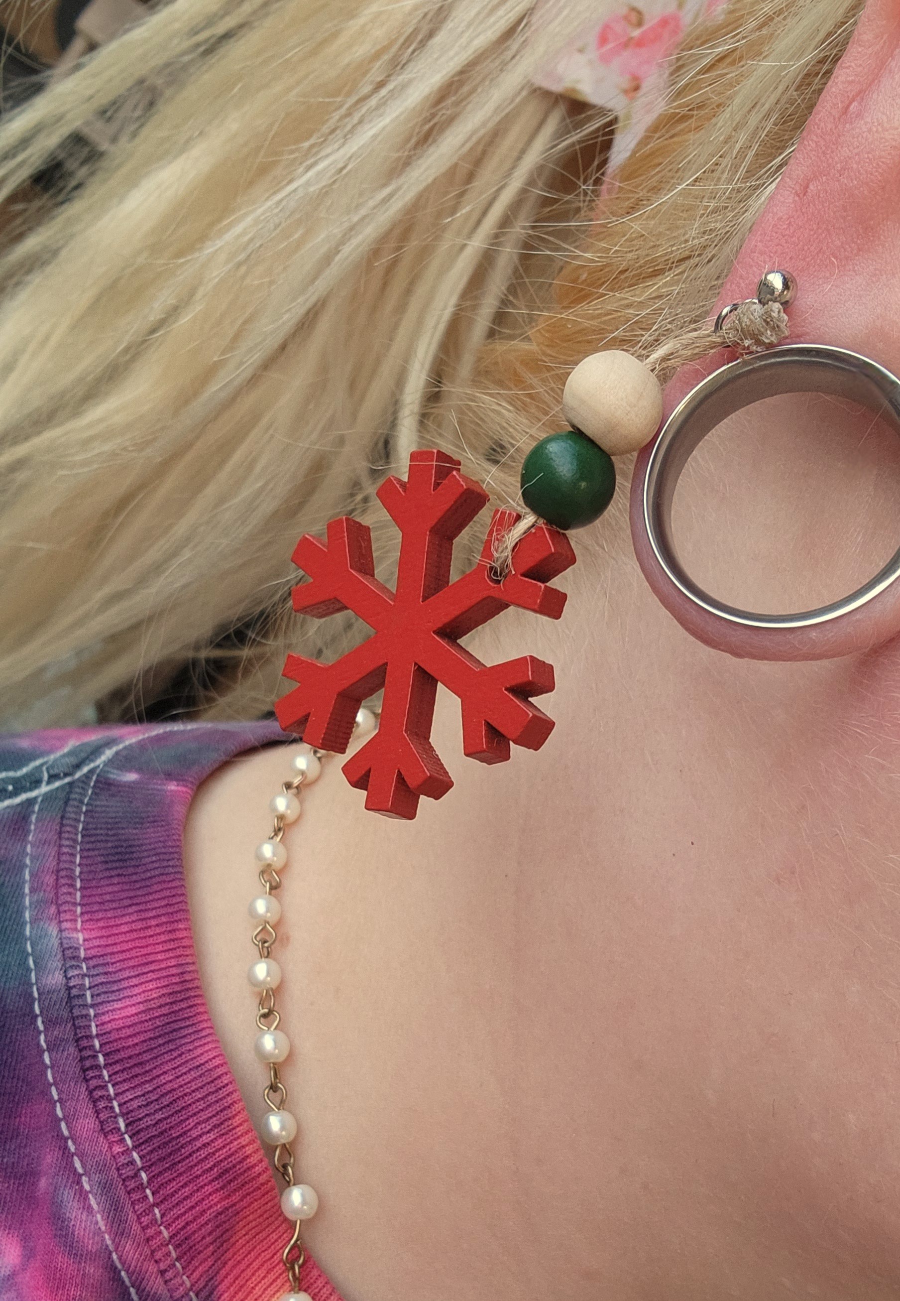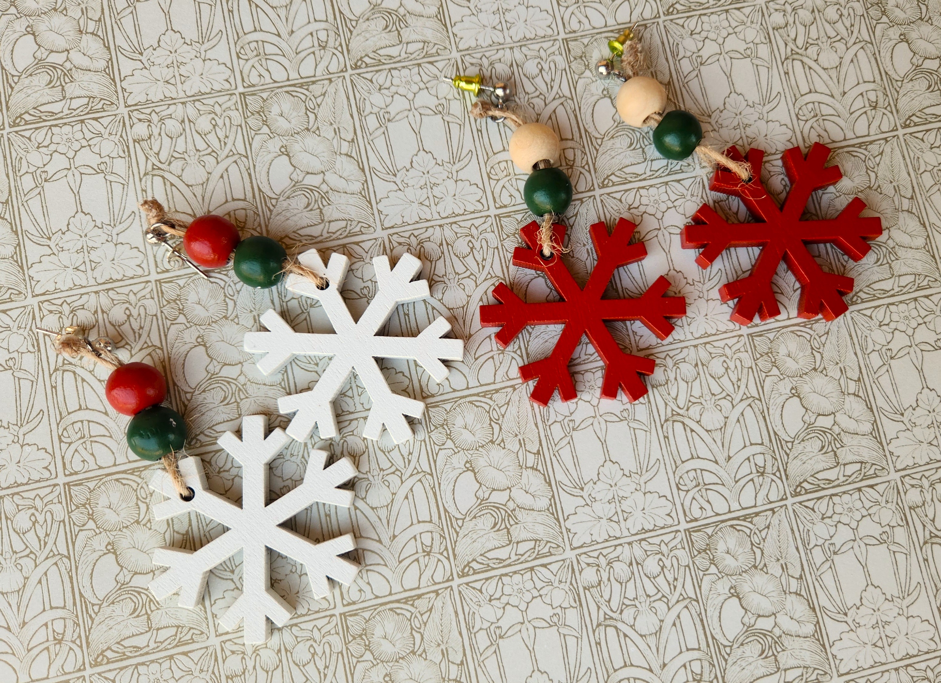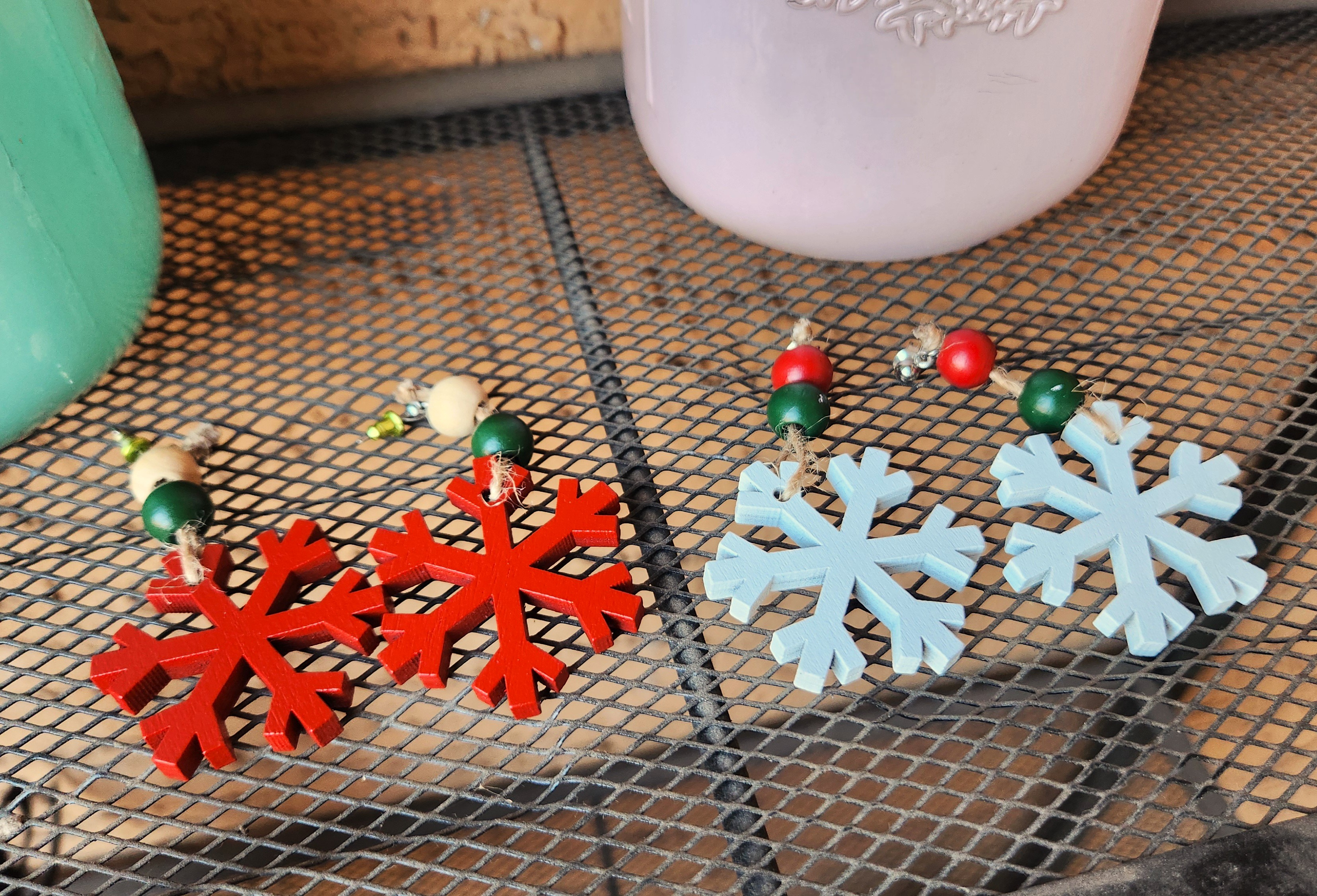 Lightweight wooden snowflake charms and beads on twine, choose from red or white! Only one pair of each color available so grab 'em quick!