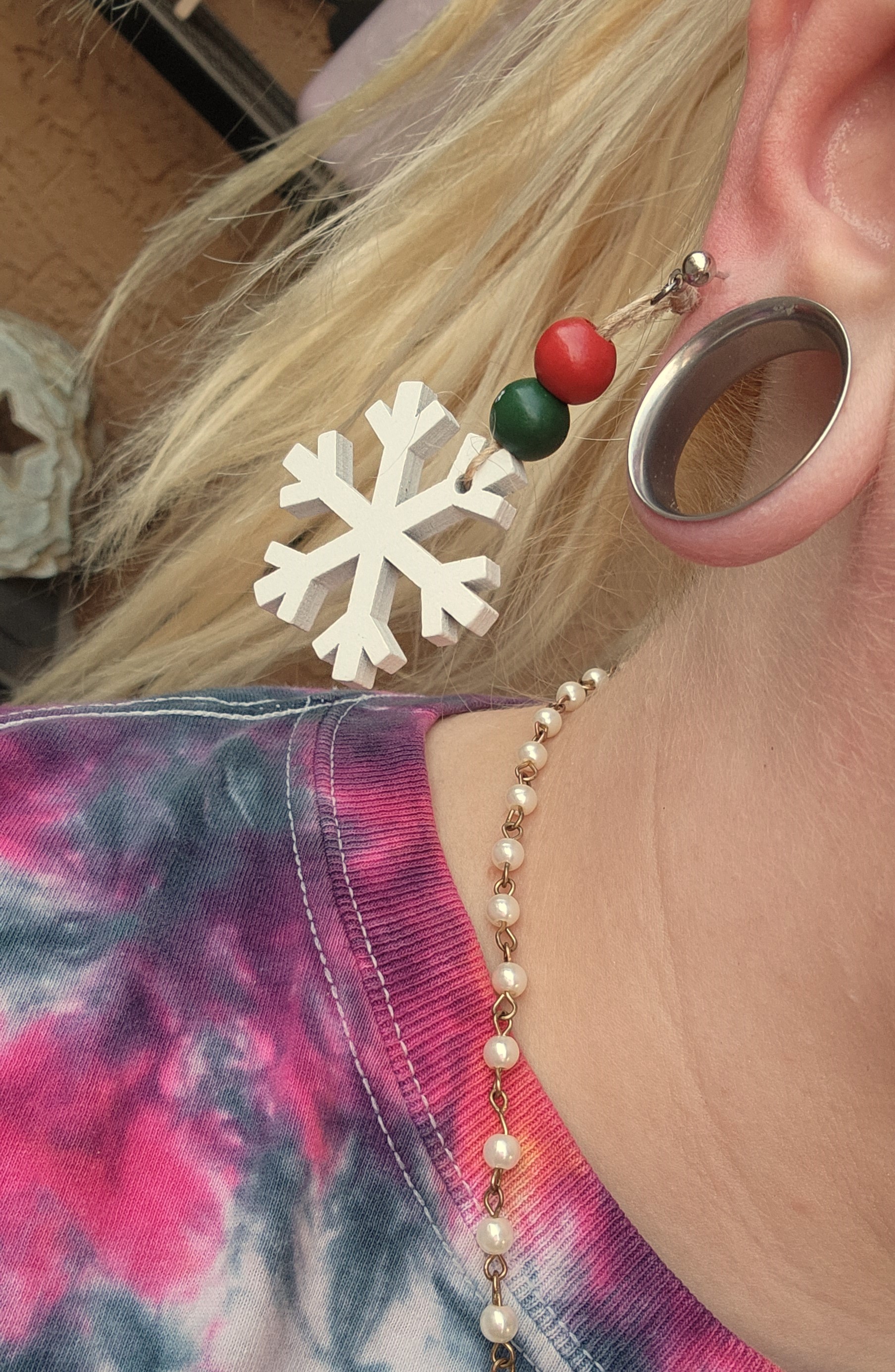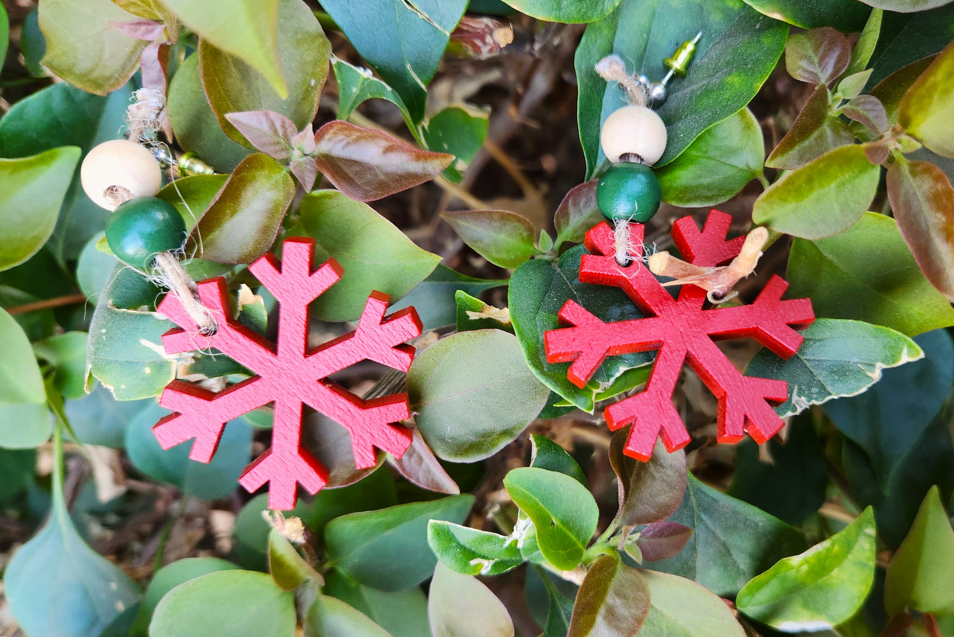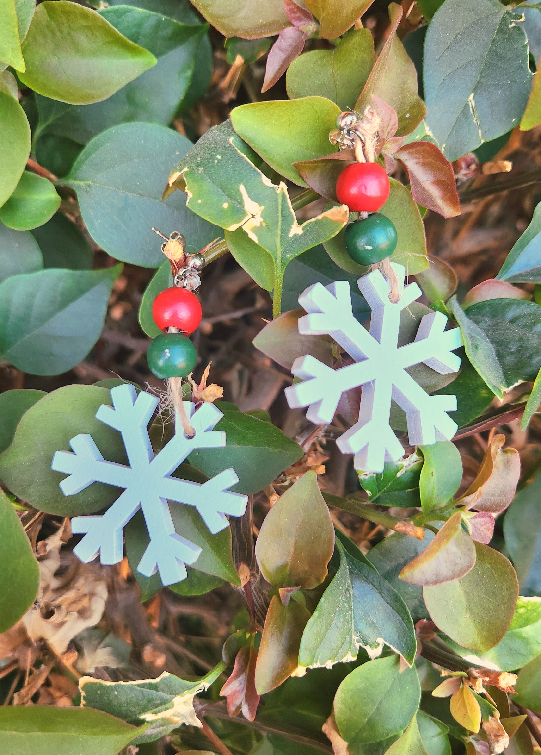 Lightweight wooden snowflake charms and beads on twine, choose from red or white! Only one pair of each color available so grab 'em quick!