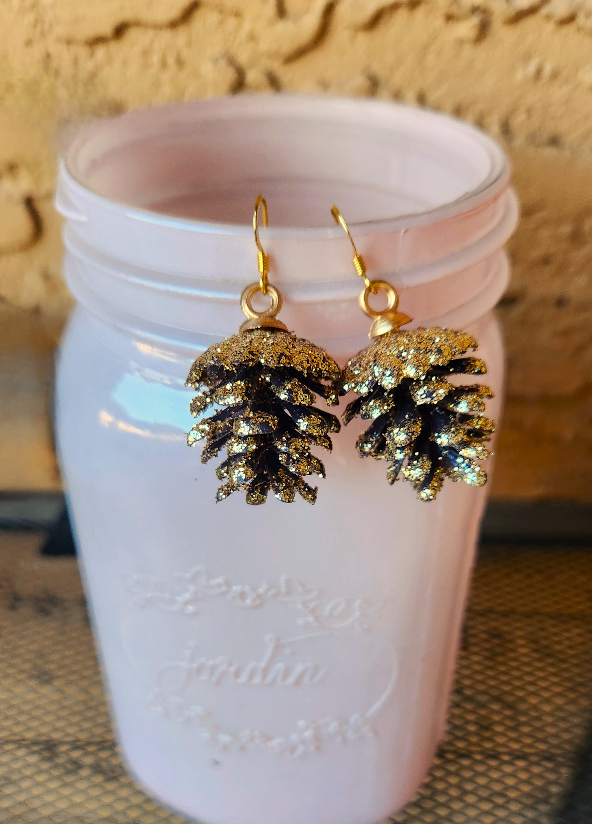 Very lightweight pinecone charms covered in gold glitter, straight from a wintery forest! 4 pairs available! - 1 3/4" long (from top of hook to bottom of pinecone) - 3/4" across (at widest point)