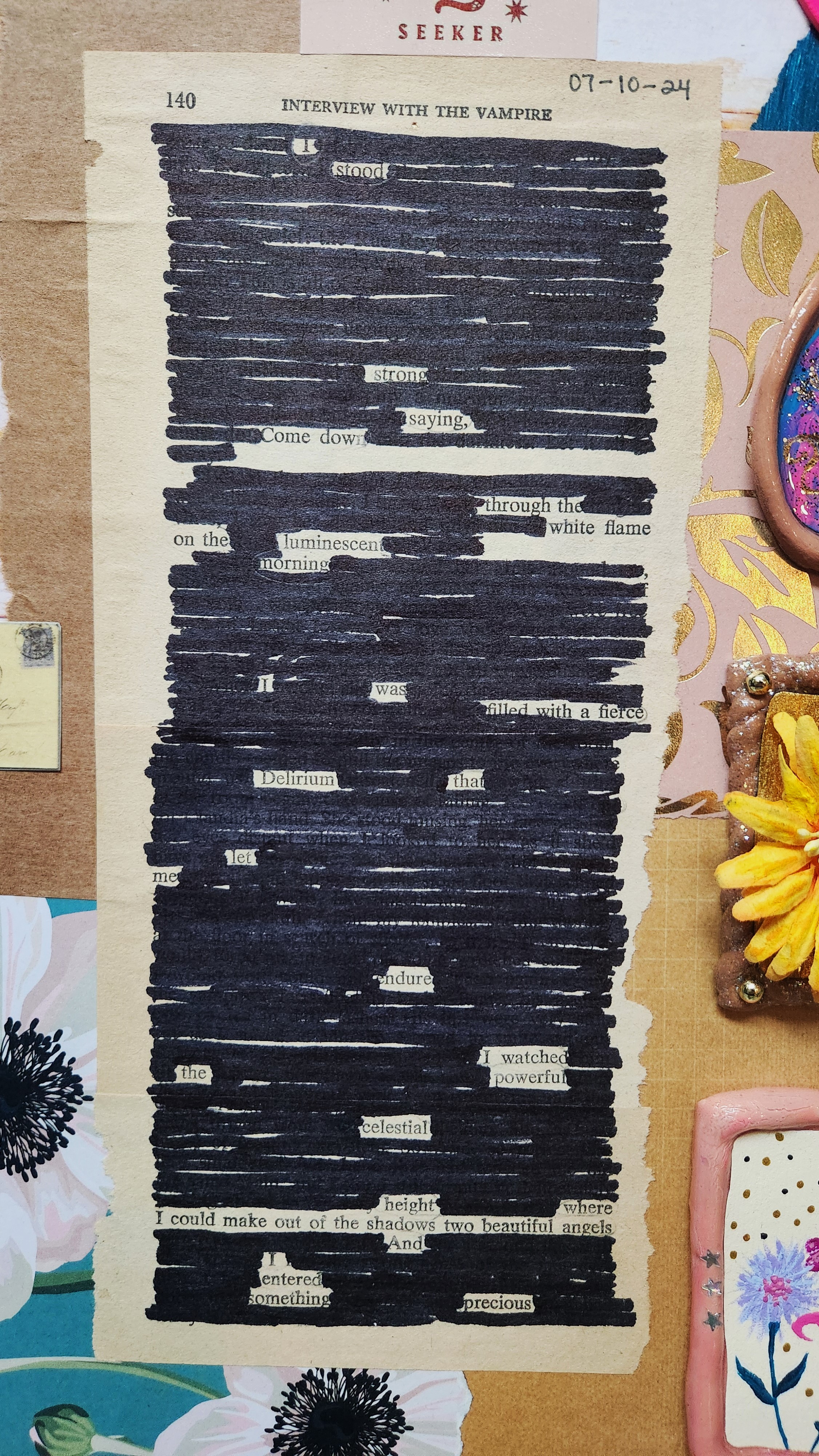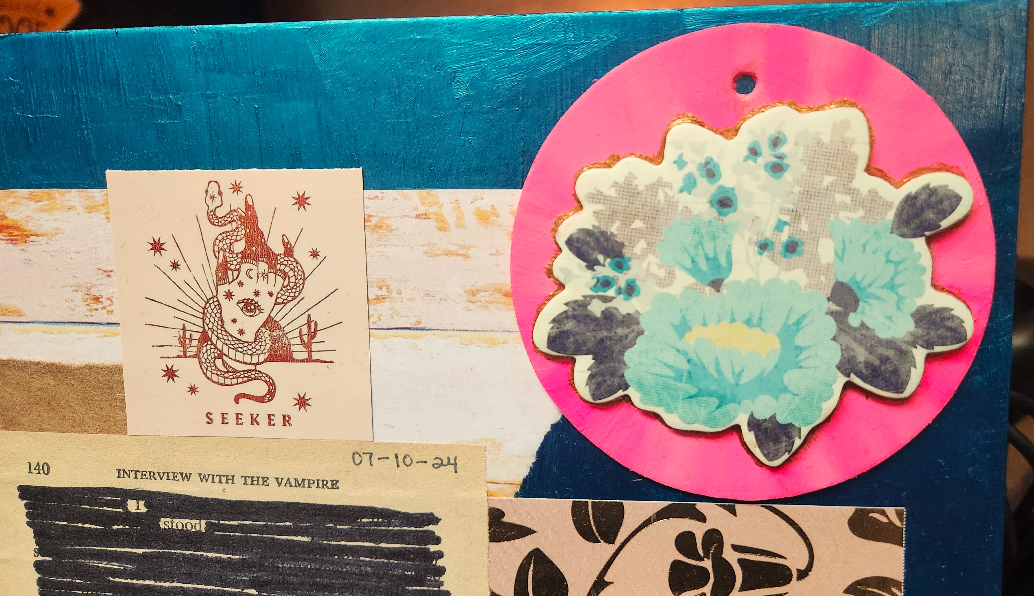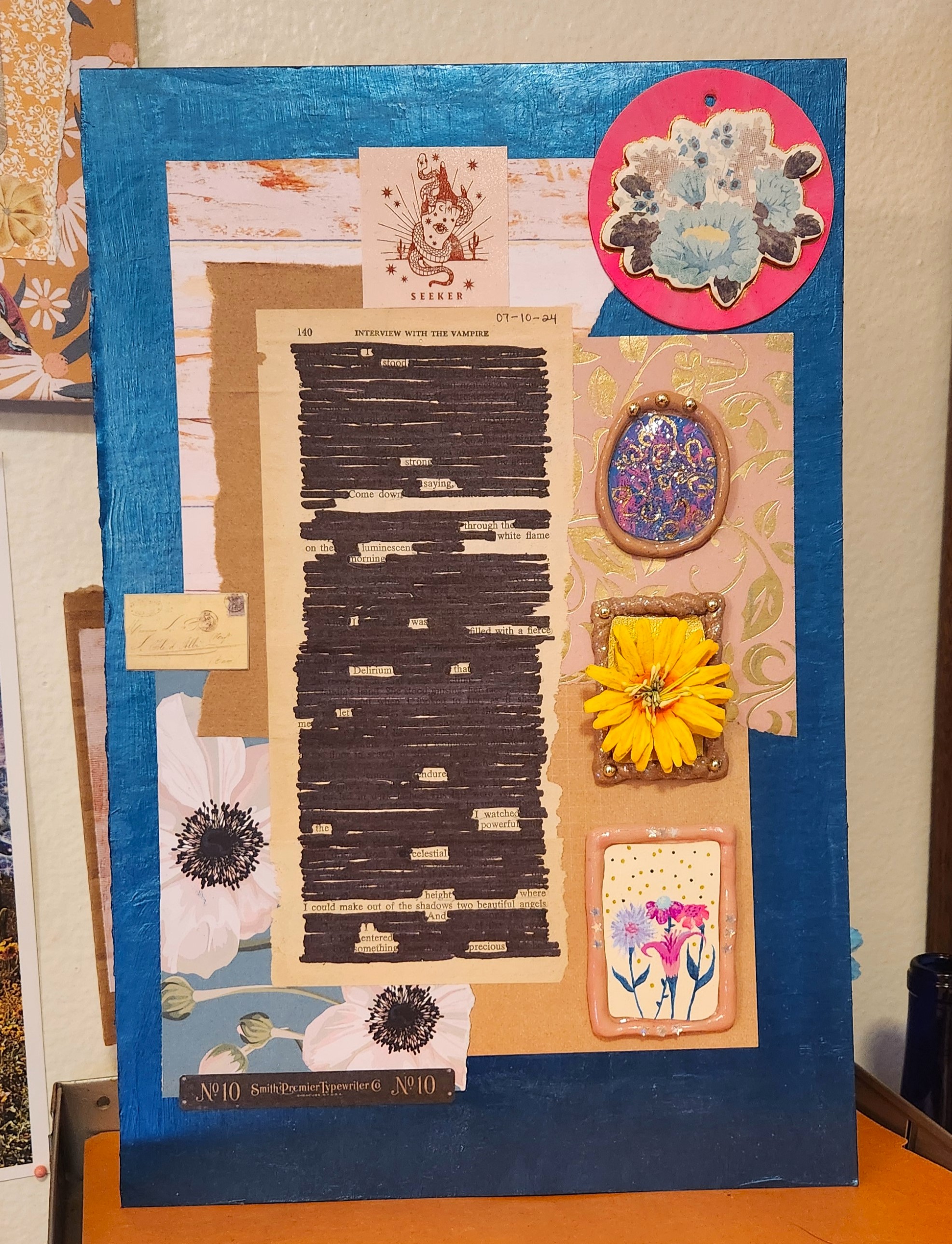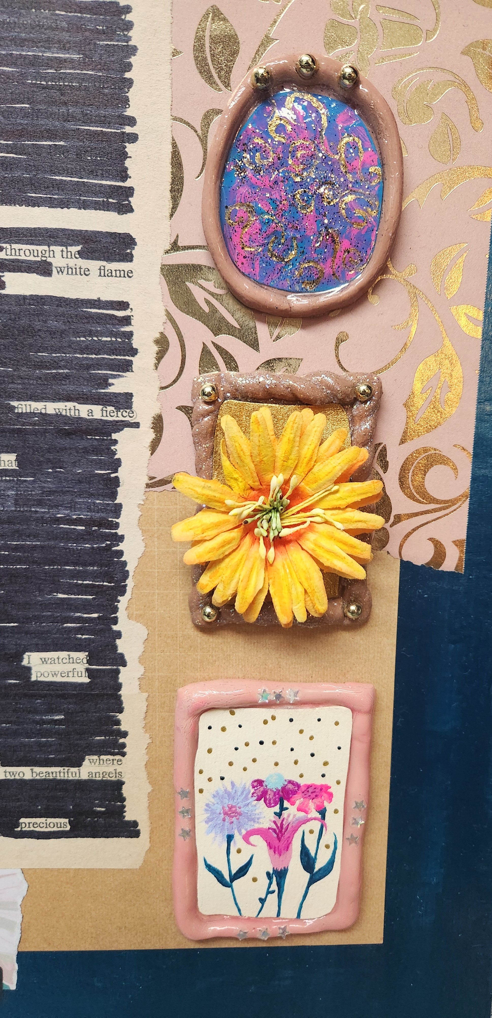 One-of-a-kind mixed media collage with various papers, blackout poetry, mini handmade clay picture frames, tiny pieces of art and a fake flower in the frames, and acrylic beads, on a shimmery metallic acrylic paint background, on illustration board