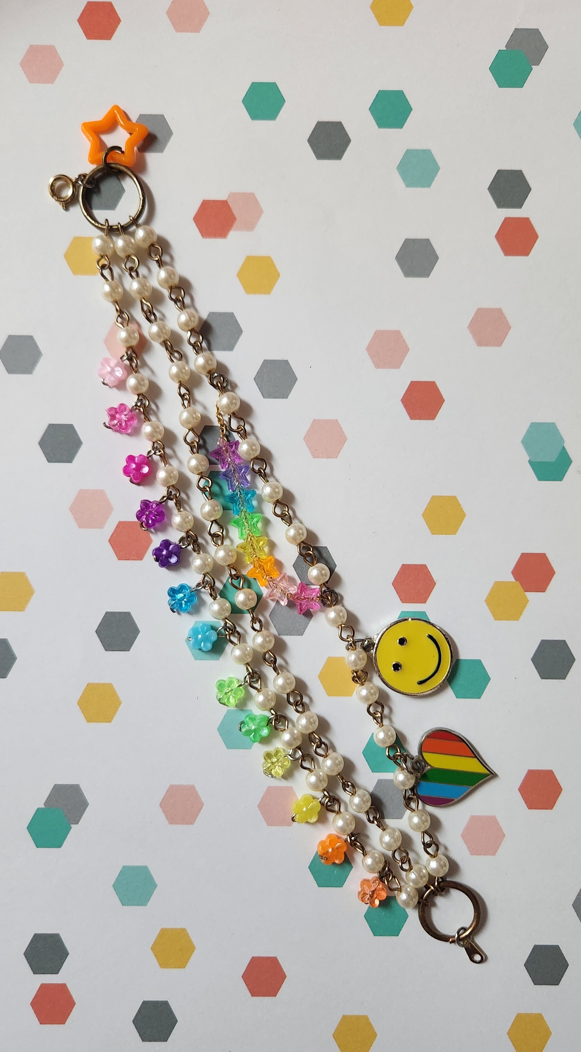 Maximalist 3-tiered bracelet with a pearl-style link chain base, colorful acrylic flower dangles, a rainbow star dangle, and star, smiley, and rainbow heart charms! - approx. 7 3/4" long