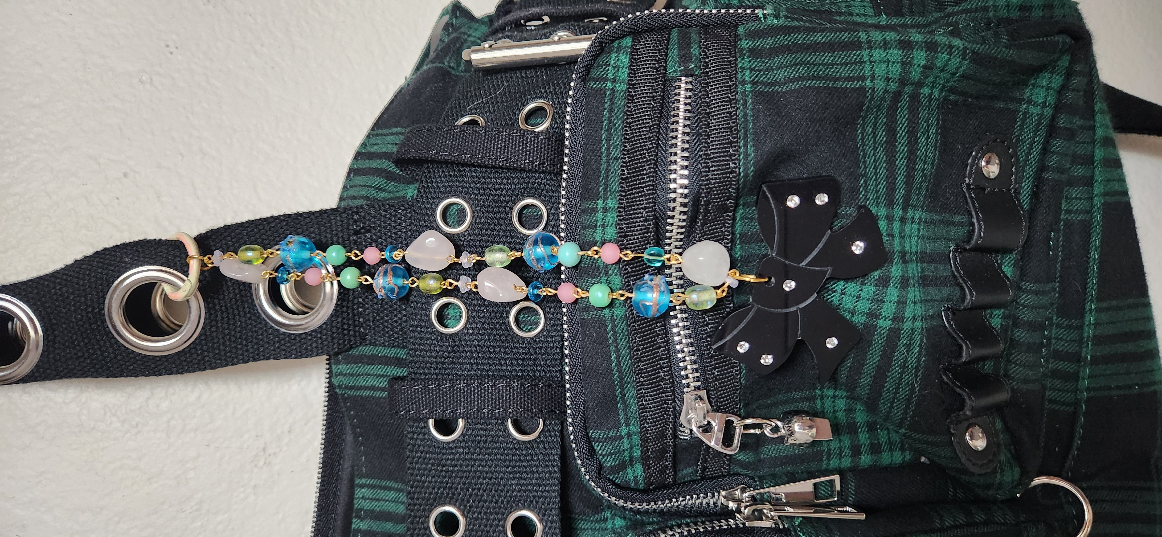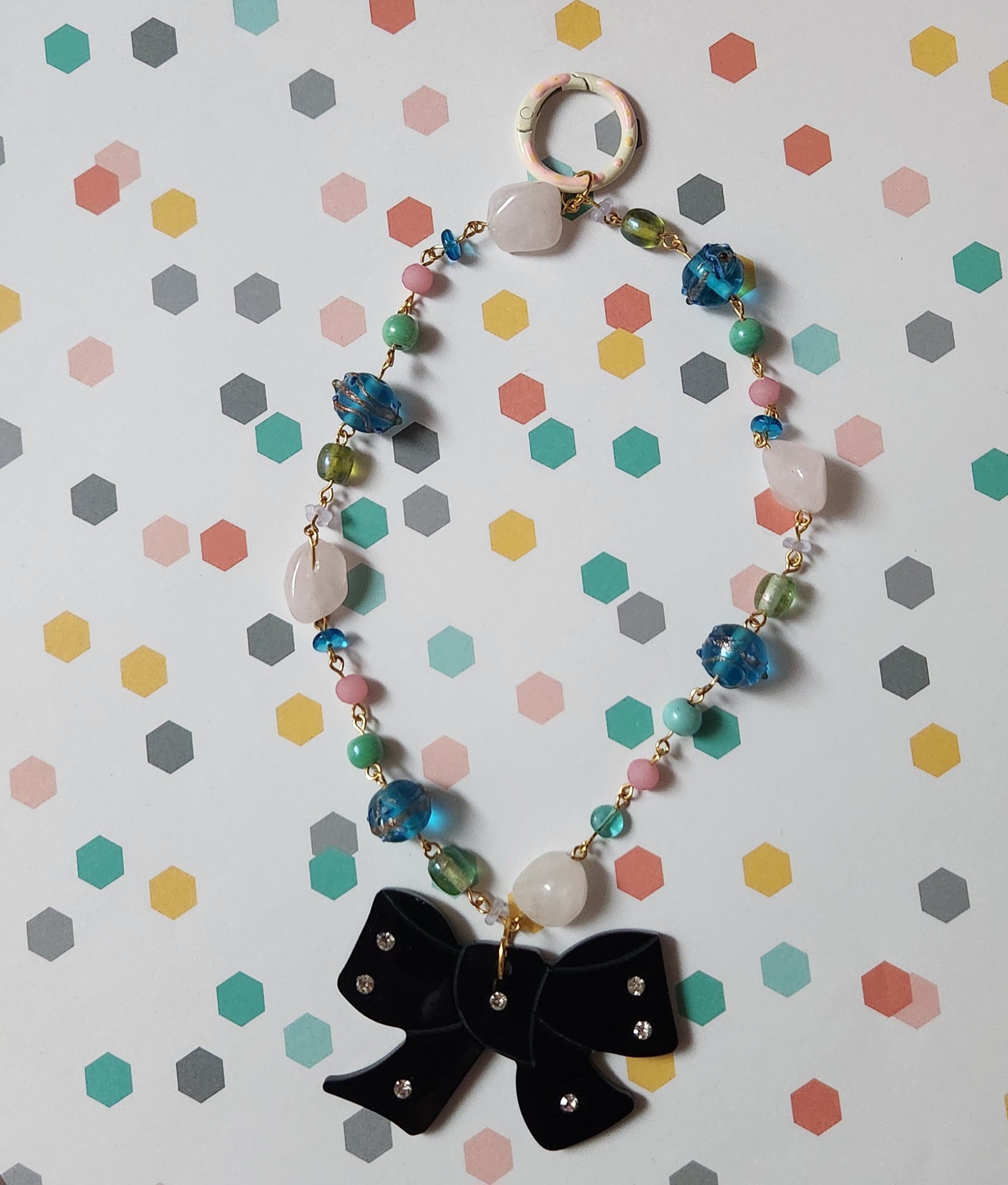 Twee-inspired bag charm with blue, teal, green, pink, and rose quartz beads and a large black acrylic bow pendent! ๐ - approx. 14" around - bow: 2 1/2" x 1 1/2"