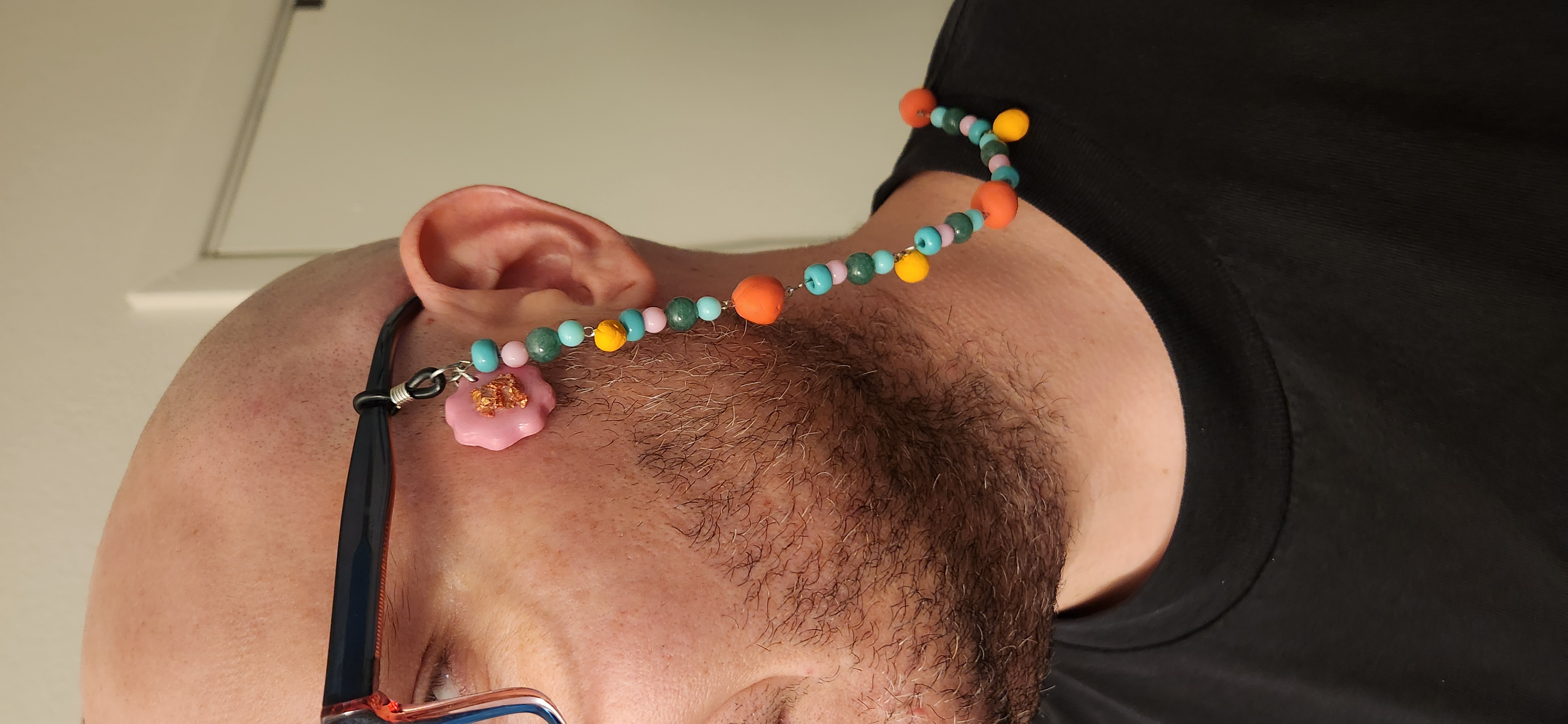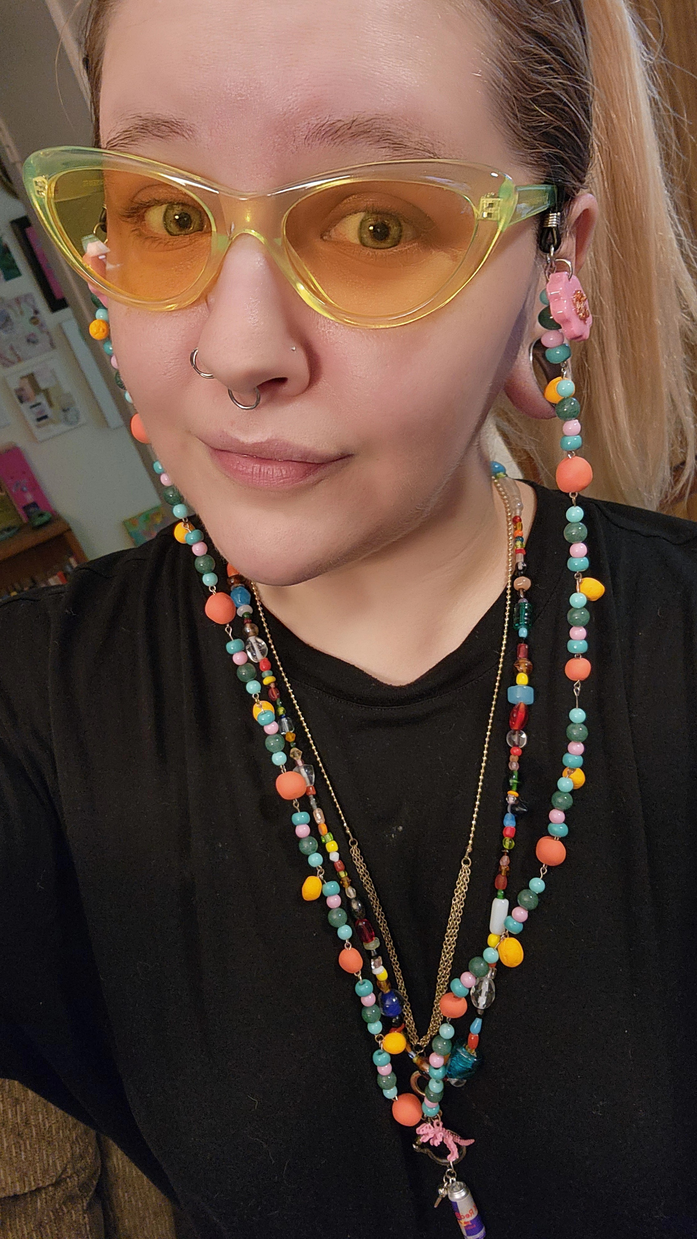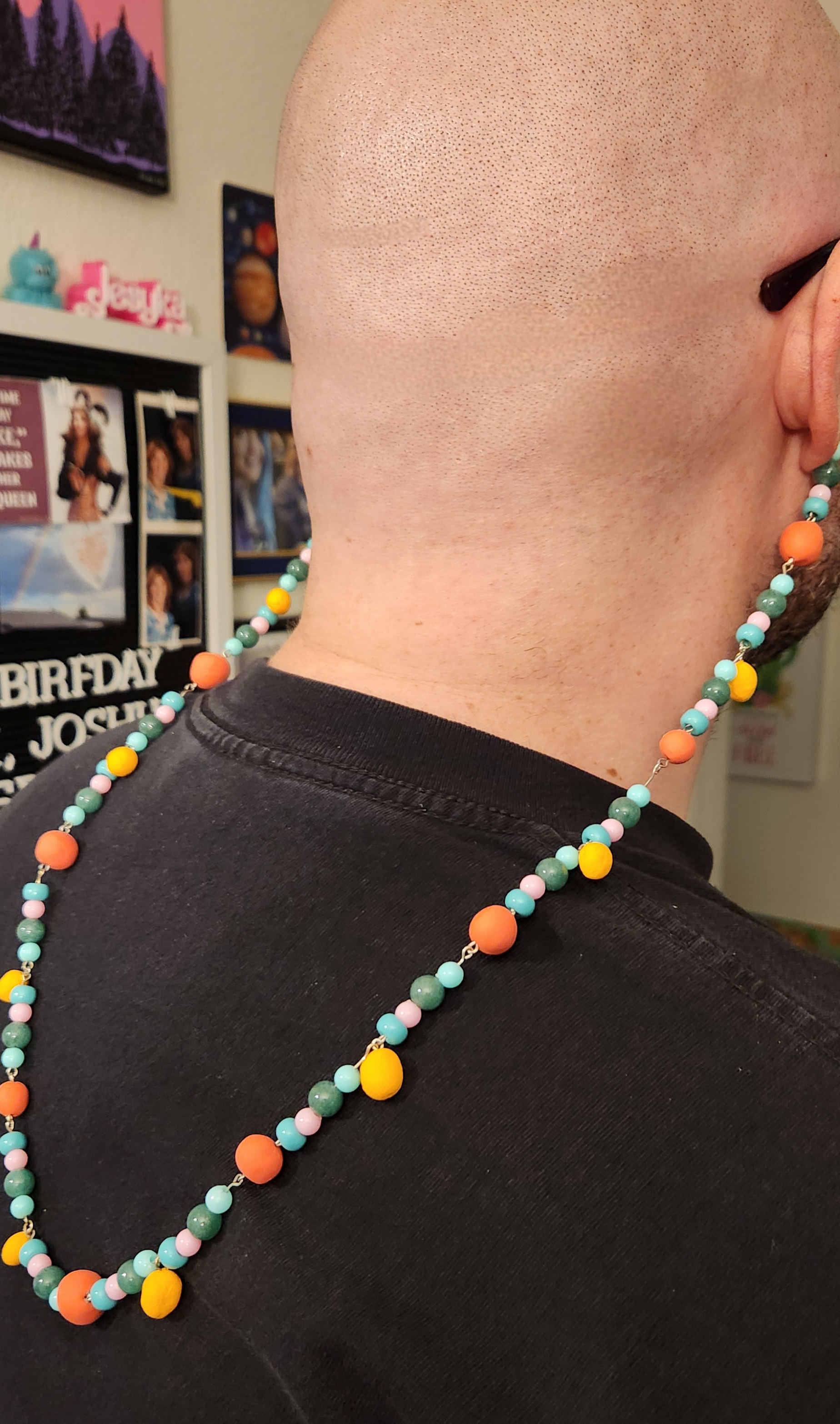 Cottagecore-inspired blue, teal, green, yellow, and pink glasses chain with glass and acrylic beads and handmade polymer clay beads and charms! Who ever said glasses chains couldn't be whimsical and cute 🥰 (Special thanks to my sweetie Joshua for modeling for me ❤️❤️❤️)
