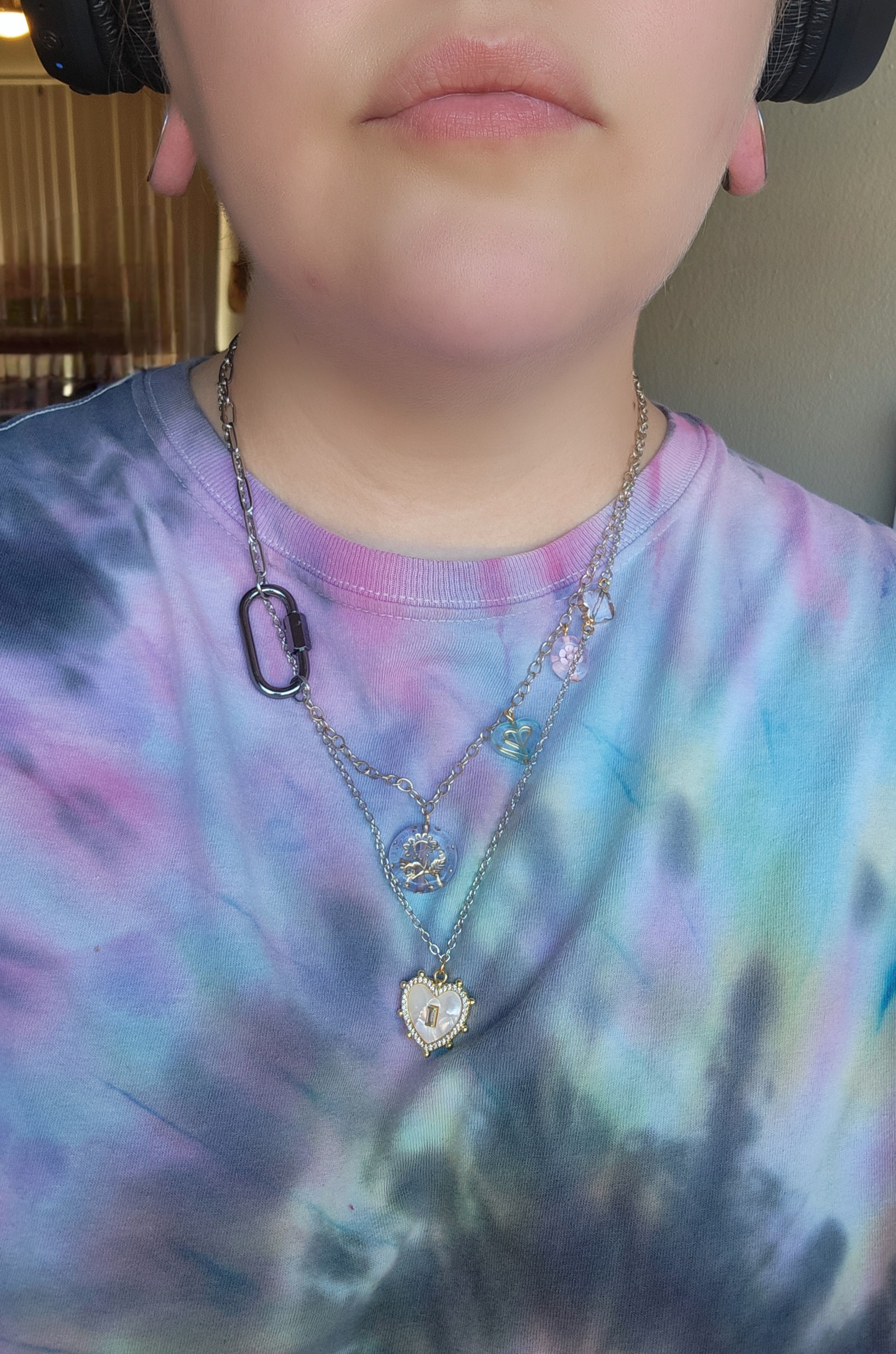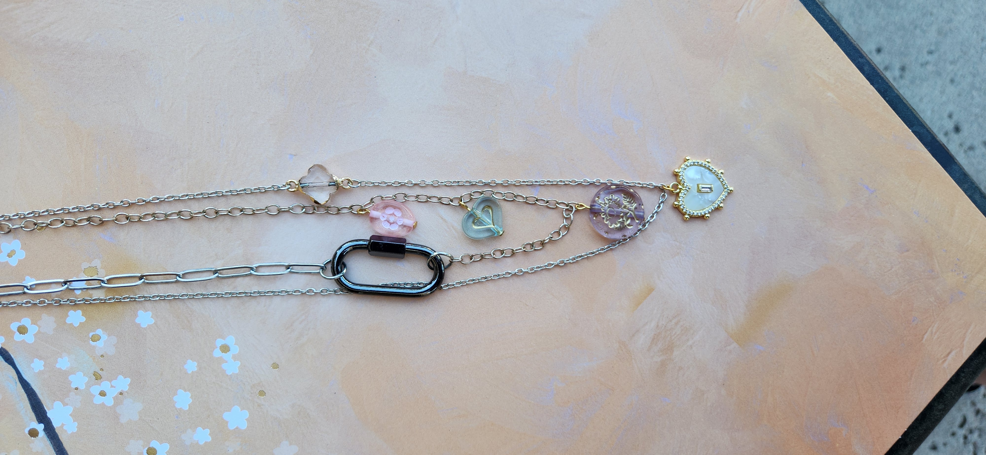 Kinderwhore aesthetic from the 90s ~ think Courtney Love when she was in Hole! Three different styles of chain in two layers with various charms and a small carabiner connector - 21 1/4" long